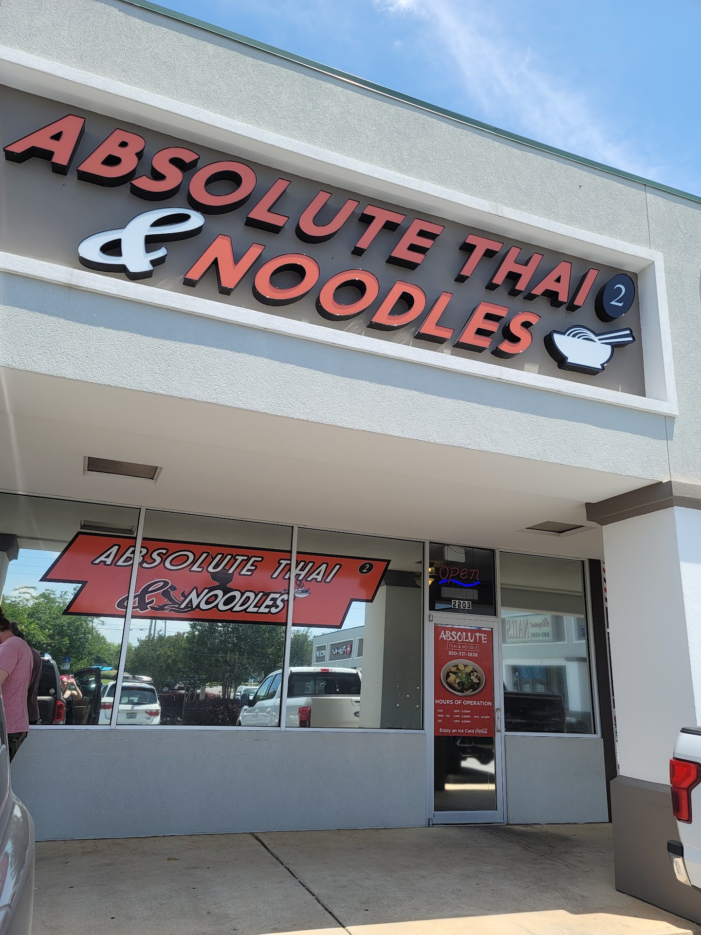 Read moreThey just opened on November 6th. I dont want to slam the other Thai eateries in Crestview. But Absolute Thai Noodles is beyond my expectations. Their Beef Noodle Soup is AMBROSIA TO THE SENSES. It has layers of flavor. I always get extra napkins because I love mine served Thai SPICY HOT. The beef is marinated for hours. There are pieces of beef ball throughout too!!! Its even better is you let it marinate and take it home. They truly care about their food. The Seafood Tom Yum Ramen is another favorite. There's a huge Fillet of white fish, shrimp, classic, Krab, mussels, and clams. It has a robust flavor. You can't go wrong here. Yes, they just opened, and are trying their best. You will have to wait awhile, unless you order ahead for Pick Up. We went opening day. The Hospital is close by. We arrived at 11:00, when they OPEN. The hospital staff ordered almost a dozen meals. If you LOVE Great Food, give these guys a chance. You WON'T BE...