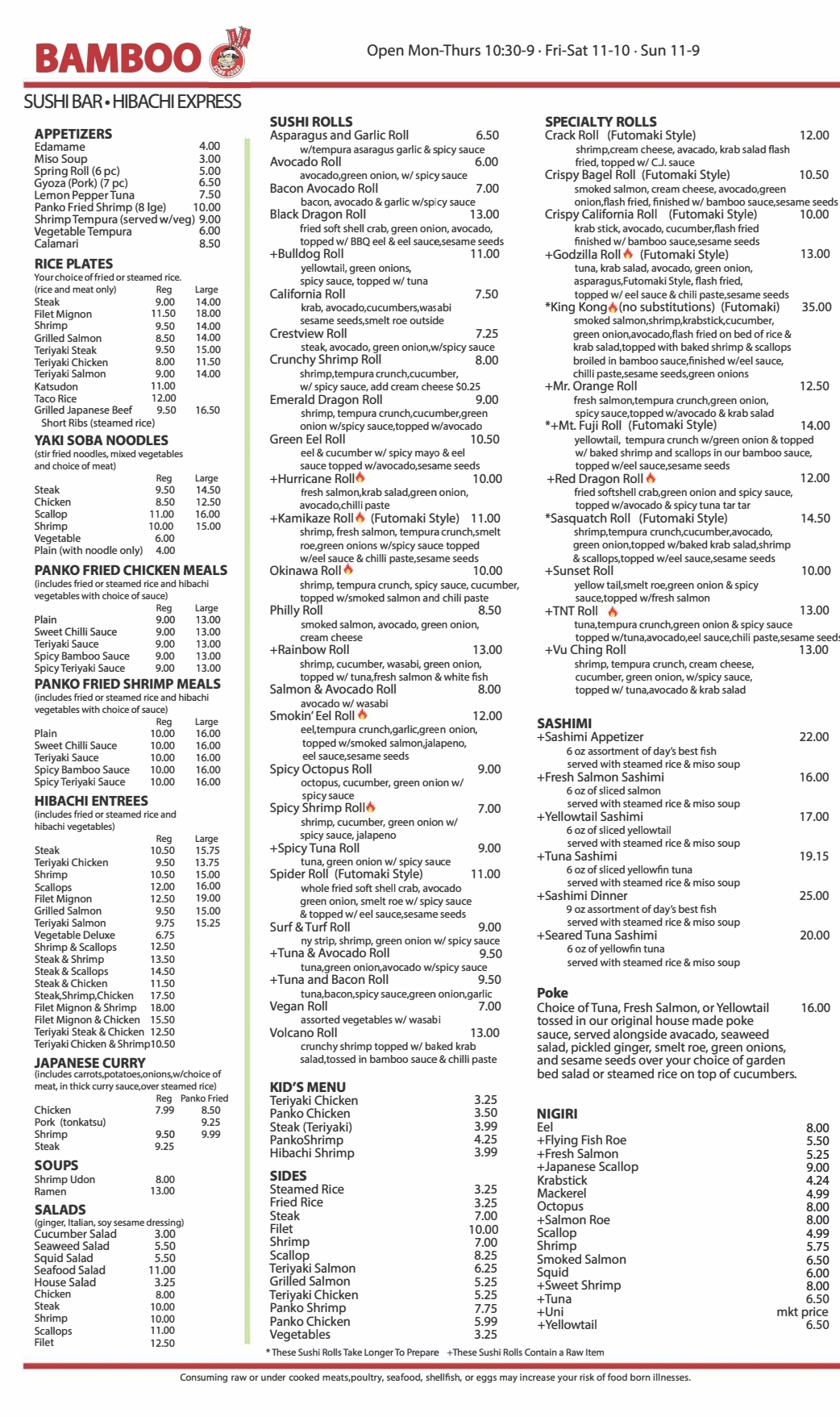 Read moreThe restaurant was filthy with dust and dirt everywhere on the floors to above your food on the wallls and tops of booths. The woman with glasses that took our orders was rude and defensive when I asked how they cooked there rice several times a day and is not made to order( Panda Express strategy) The meats was super low quality and chicken was overcooked to boot. This is not NOT a real Hinachi even though the place claims it. They can’t even fry proper rice here as fried rice is always made with day old rice is Japanese culture. Because they make it with fresh rice it’s has les flavor and they rice matches that of cheap uncle Ben’s ready rice with swollen mushy rice. The springs rolls were frozen. It fresh that taste was very apparent to the taste and they were soggy muddy inside them definitely processed not made fresh. This looks like it should be a pizza place the overall vibe. We definitely won’t be going back there I’m I’m sorry for those who think this is Hibachi but if you want the best friend rice in the area hits Palmas up the road it’s made properly and the Lumpia also made from scratch. Bamboo was a MASSIVE disappointment given wat I see in the Google rating and trip advisor and local friends. Look the food was edible YES but did we finish and take togos noooooooooo if ur looking for real hibachi don’t do it. Even the sushi was sloppy and loosely rolled and disintegrated with the slightest dip of soy sauce…::::: how this place has made it 18 year in business they must have cheapened there selves at some point is all I can come to on that. HIBACHI FOODIES STAY AWAY U...