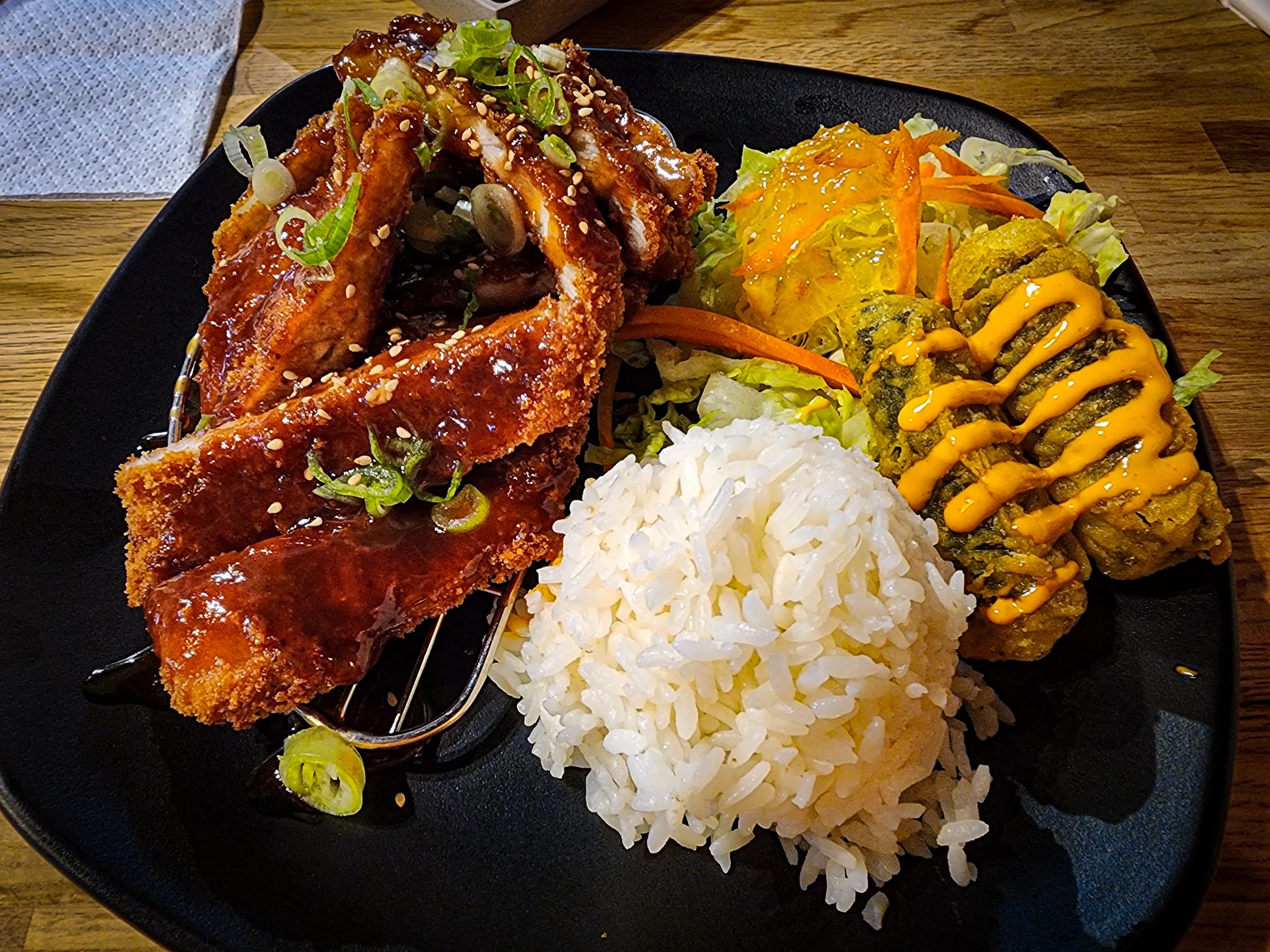 First thing I noticed is that the menu changed. Not a big deal with new management, but it was strange to see that a menu that has only been in use for a couple weeks already has things crossed out and replaced on it. No matter. My husband tries to order the Korean fried chicken appetizer, and the waitress tells him they are out of fried chicken. Okay. Fine. He orders dumplings instead, which ended up being flavorless and greasy.