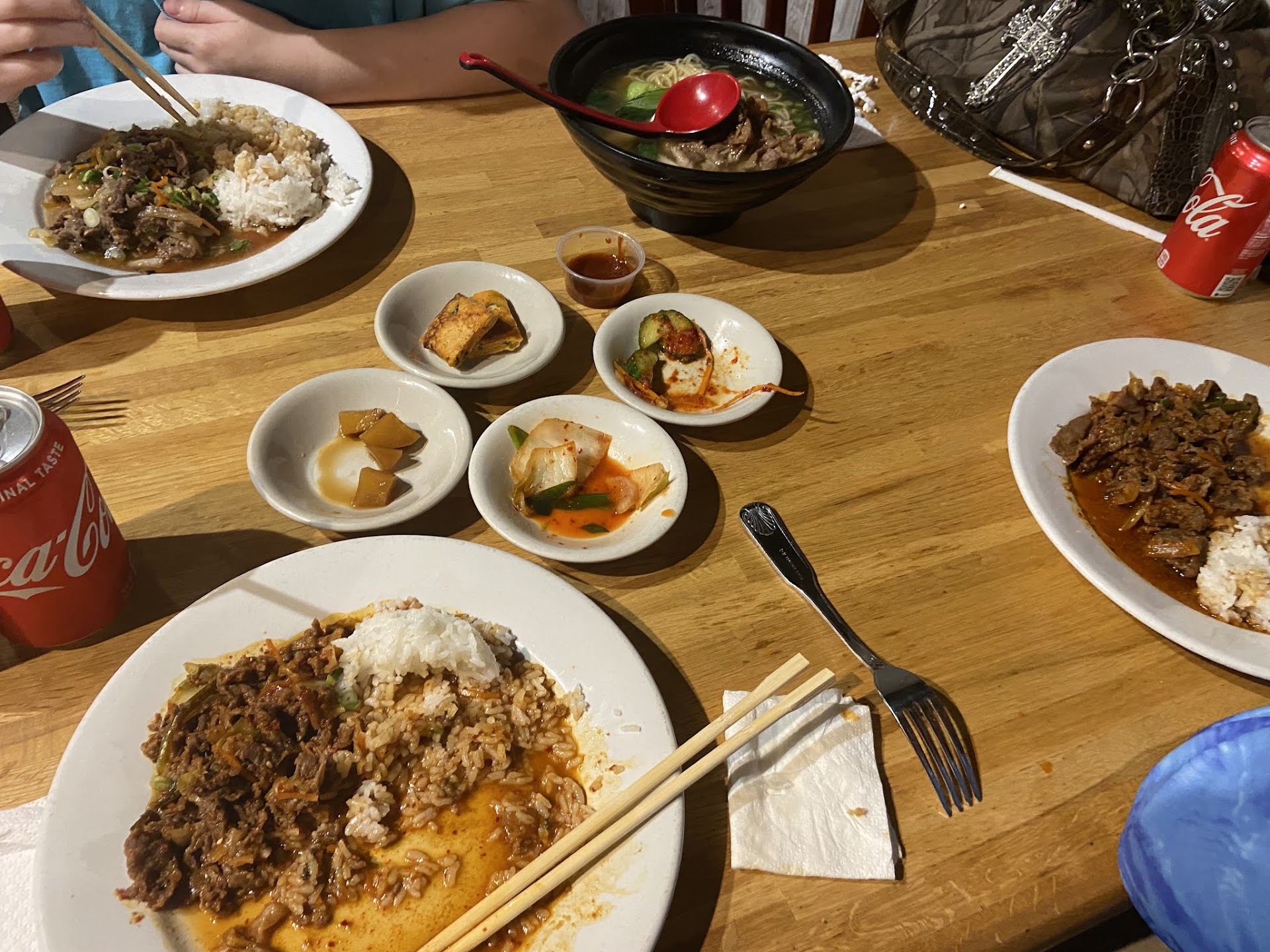 Now for entrees. He orders the Japanese ramen, I try to order the spicy squid. She tells me they're out of squid. They've only been open about 11 days, and they're already out of everything? Fine. So I order chicken bulgogi. Only in hindsight do I wonder why they're out of chicken for one dish but they can serve it in another.