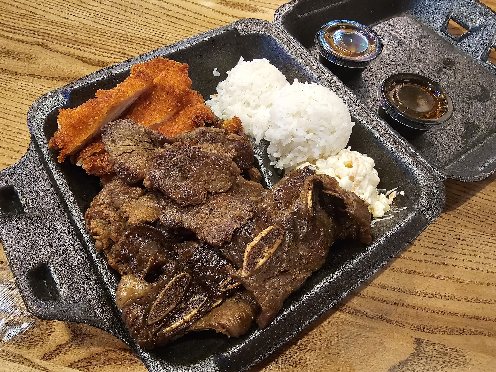 The cashier was pleasant and helpful as she took our order of a Regular Plate which comes with 2 scoops of rice, one scoop of macaroni salad, steamed veggies (broccoli and cabbage) with two meats served on top. Our meat choices we identical which included Chicken Katsu and BBQ Chicken. We were given cups for our drinks and proceeded to the drink station. The drink station is located on the west end of the service counter right next to a single glass exit door where the sun was blaring in. I noticed that the ac did not appear to be working at that time as it was very unusually warm inside the restaurant. There were no other customers inside dining. I attempted to get ice from the dispenser but nothing came out. I notified the cashier and within a few minutes another employee brought out an open bucket of ice from the back. She grabbed a chair from the dining area and used it as a ladder/stool to remove the lid from the drink/ice dispenser machine. ( it reminded me of when I was at Captain D’s a few years ago when the employee brought out a bucket of ice and sat it on the floor while removing the lid to the ice bin. Then picks up the bucket of ice from the nasty floor and pours it into the ice dispenser). Anyway, I was then able to get ice. I wanted ice tea so I filled my cup with sweet tea and about puked when I took a sip. It was soured tea. I notified the cashier in which she took steps to rectify the situation. So I decided to get a Dr. Pepper instead. The cashier was kind enough to replace our cups with fresh ones. Our food was ready by this point and was put into a to go bag. But we had planned to dine in. There were other customers few as they were drifting in. And a couple or three door dash or equivalent. I believe that the drink station is lacking in so many areas. First it was in direct line of sunlight shining in on the containers of tea heating them for who knows how long. And the ac not apparently working correctly ( I noticed a fan at the east end of the counter sitting on the floor. I believe that many factors contributed to the sour tea, including staff not checking on it or ice. The floor had food stuff that needed to be swept. Someone could have slipped and fell and possibly causing serious injury. It was apparent that no owner was on duty during dinner time. Now getting to the food. The chicken Katsu was hard and overcooked, the bbq chicken was cooked to perfection done but lacked flavor. The macaroni salad was very nice but needed black pepper which wasn’t on the table but I found those tiny packets on the service counter too late. The steamed veggies we very good but lacked flavor as well. And the veggies would have been much better served in one of the compartments and the dry rice under the meats that would have soaked up some flavor from the two sauces that were provided. Staff did replace the tea, but I drank soda Oh well. I also noticed there was no music and the only sounds were coming from the kitchen with an occasional clatter of a pan or lid. The other 3 employees were sitting in a booth behind me having a feast and chatting. I don’t recommend this place with all due respect. The other place on the north end has them beat hands down. I don’t see this...