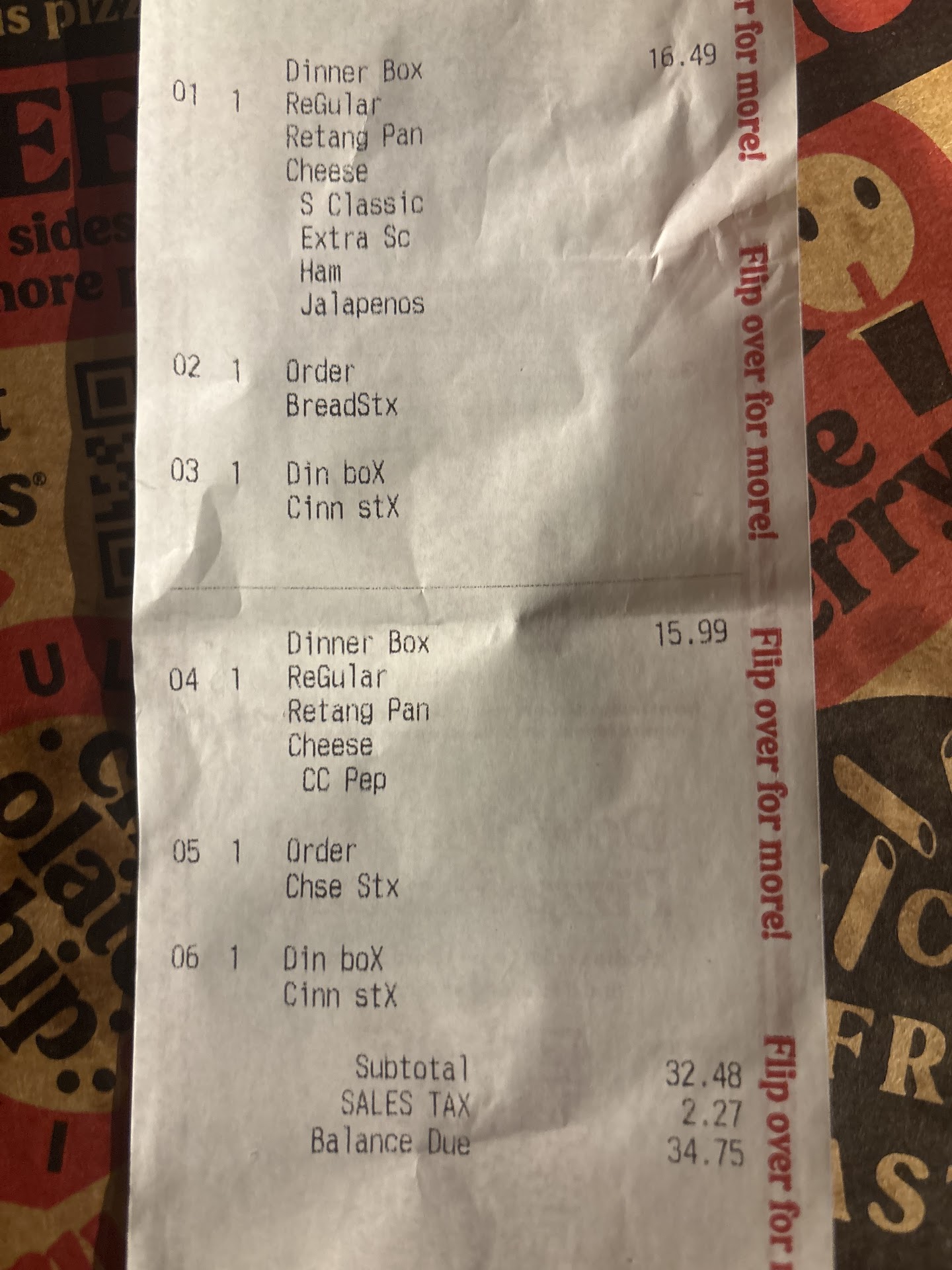 Read moreI came in from out of town and visited this location on May 24. I was waiting on my order when this Allison lady came in. She asked to see her pizza then complained about holes in it? The cashier offered to remake it and even asked if extra cheese was supposed to be on the order. The lady said no but go ahead and remake it. The cashier put the order in and even told the cook (polite young black guy) to be sure to make her order. At this point I’m sus about this lady bc she just puts off Karen vibes. Sure enough she yells back to the cashier “am I gonna have to make do with cold wings and cheese sticks?” Cashier comes back and said no ma’am I placed it all to be cooked fresh. She leaves and the cashier and I start chatting about various things to do around town. The order comes out and the lady comes back in finally. They show it to her (now the cook, the cashier and I assume it’s a delivery driver are all making sure it passes). Lady goes ITS BURNT Just cancel it. And then storms out. She did sit out side in front of the door for 20 min so I couldn’t leave bc she was freaking me out.