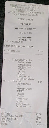 I called to place an order for pickup was willing to pay for it in advance and I live 10 minutes away from the store the first of all I could not understand the lady that answered the phone at all she mumbled a lot and had a very thick accent she was super rude so then I went online and ordered got there and she didn't even ask me for the receipt or my name all I did was point me in the direction of the sandwiches when I said hey I'm here to pick up an order I placed online the when I arrived home neith sandwich was labeled so without opening one i could not tell which one was which very poor not satisfied worst subway...
