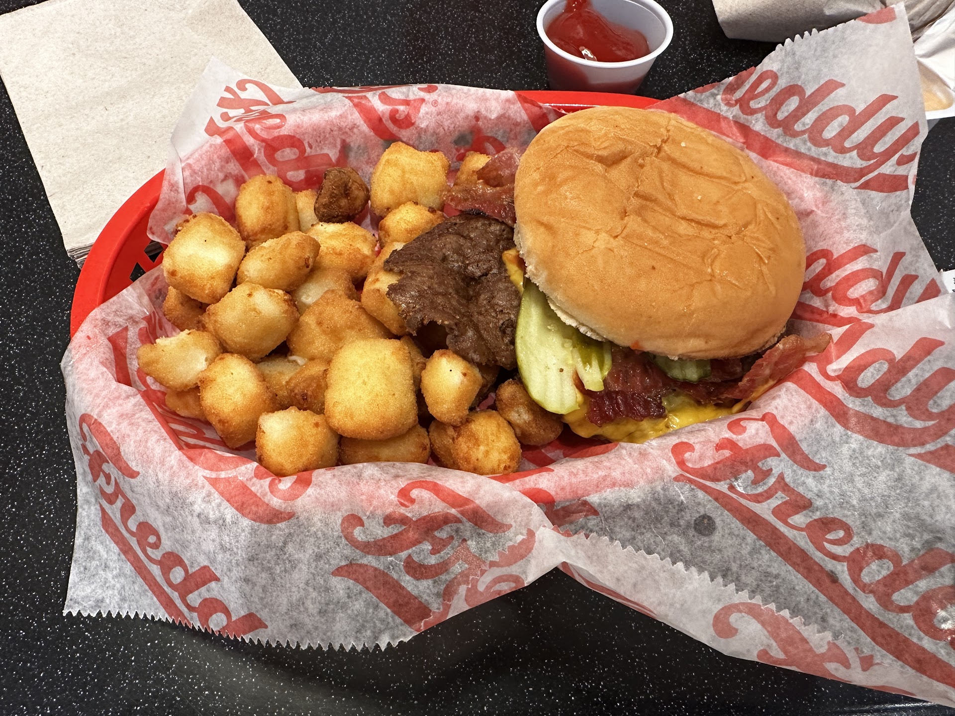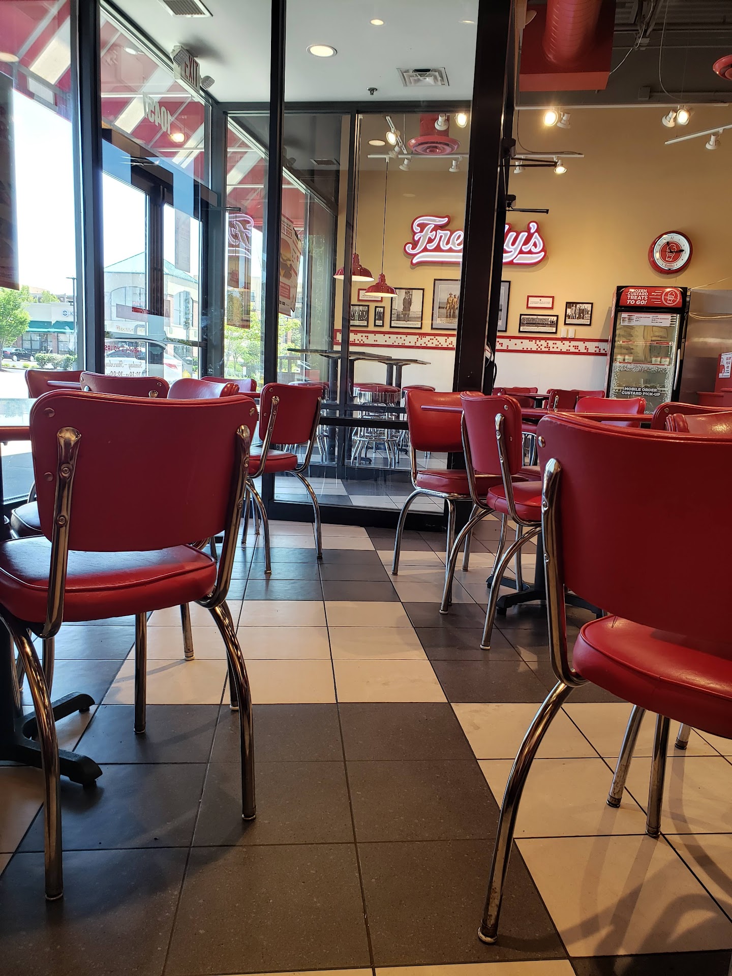 On a recommendation, I looked forward to a tasty meal from Freddy's Creve Couer and stopped in recently. Upon walking in I made a quick observation that the dinning area was trashed. Ok, I was planning on carry out so I looked passed it. Once my order was placed I went to fill up my soda and walked passed the kitchen and order pickup counter where once again I observed how trashed those areas were. After I filled up my soda I reached for napkins only to find that the 2 dispensers were empty. I thought to myself, I hope the food is worth what Im forcing myself to already look past. While waiting for my food I could not help but continue to notice just how trashed the kitchen was...floors absolutely covered in food, counter tops where food was prepared looked as if they had not been wiped down in hours, and order pickup counter covered in old fries and debris. Like really, with the amount of employees in the restaurant at the time someone could not take 5 minutes to police these areas for not only cleanliness but safety of employees or customers slipping? Just as I was about to bring what I was witnessing to someones attention, finally an employee asked another to wipe down the order pickup counter but took it upon himself to do it. Would have been a satisfying effort to observe but the person with the same gloves he was already wearing to make burgers, wiped down the counters with his hands, and then proceeded to continue making food without so much as changing out his gloves. After 20 minutes of wait time for my food and observing the lack of cleanliness not being upheld, I immediately lost my appetite and cancelled my order asking for my money back. I will give this location the benefit of doubt and say, maybe it was an off night, but my first and last experience with this location was disgusting. If anyone had an allergen to note in their order, no way their food would have been prepared properly to avoid getting sick or worse from cross contamination. I genuinely dislike leaving negative reviews but the fact that management was not all over this themselves is terrible.....well, management. As someone who spent years in the food and beverage industry I am shocked at how bad someone let this get in one evening. All this from what I could see, I can only imagine what I was...