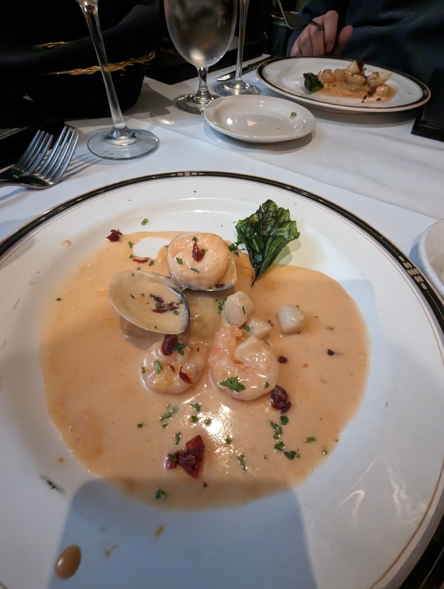 Specifics: They take reservations and, although I didn't need one this evening, I appreciate it anyway. Our party of four was seated immediately at 630pm. The restaurant is very attractive from the outside. It was too chilly this evening to sit outside, but the dining room is very pretty. The tables are nicely spaced, the noise level is just right, and the table settings are cloth and china. Most comfortable but still feels elegant. The owner is on premises and paying attention. Service was attentive without being intrusive. We didn't order appetizers, but they brought us a complimentary starter of toasted Italian bread with garlic and cheese to be eaten with some olive oil and red wine vinegar. It was yummy and a nice little starter. My husband and I shared a Caesar salad and they plated it separately for us, and the presentation was still beautiful. And it was a very good Caesar! (If we had each ordered one it would have been too much food!) My husband ordered the Tilapia and unfortunately, the chef wasn't serving it that night (I'm assuming the fish was unsatisfactory.) He was disappointed but ordered the stuffed chicken breast instead and ate pretty much every bite, so I'm thinking he wasn't TOO disappointed. I ordered the veal stuffed ravioli with prosciutto and peas and it was delicious! It's very rich but delicately flavored and perfectly cooked. And it's pretty. I ate every bite! Our friends ordered the same things we got, except one of them has tummy issues with garlic and asked that no garlic be used in her chicken. They were most accommodating. She enjoyed her dinner. It can get a little pricey. Although, my husband and I had two scotches each - call scotch - and a glass of wine with dinner with coffee afterward and a spumoni to share, and our total before taxes was $110. That's not shockingly expensive. But some of the entrees are in the $25 to 30+ range. There was live music in the bar and, while we could hear it, it was not at all intrusive in the dining room. We lingered over coffee and dessert talking and relaxed and no one was the least bit anxious to move us along (although if it had been very busy, we'd have probably felt the need to give up the table.) We were there for almost 3 hours over a leisurely dinner and having good conversation and enjoyed ourselves very much.