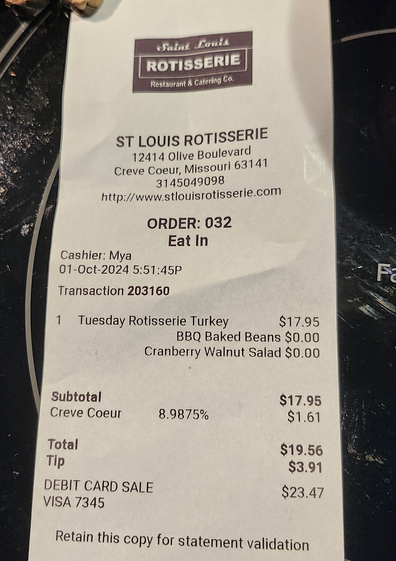 The wife and I noticed this place on our way to La Bonne Bouchee bakery. We love rotisserie chicken, but not this place! We get it all the time from Wal-Mart, Schnucks and Dierbergs. Stl Rotisserie doesn't even compare. They were out of diet soda, so we got waters. No instruction that we should get our water from the fountain. The chicken pieces were very small, had an odd flavor and were overly salty. For being dark meat, my chicken was actually dry. As a person who brines and bakes chicken multiple times per week, I can tell you the chicken I was served went over 200°F, probably 205°F. The green beans tasted like they were barely heated from frozen with ZERO fat, seasoning or salt added. They squeaked as I chewed them. My garlic potatoes were meh...a little too salty, but they are what earned the 2nd star. How exactly does one over-salt potatoes? My wife got 1/4 chicken white with salad and fruit. Her chicken was also on the dry side. Her salad had croutons that were soggy, like they had been put on the salad a couple of hours ago, a lid put on it and put in the fridge. She liked her fruit salad. To top it all off, the guy said if I had a chip in my card I should use the top of the card reader. I held my card to the reader and the tip request popped up and my card gave them an 18% tip....FOR COUNTER SERVICE! WTF?!?! The chip reader is on the bottom. I'm curious if that was intentional. Overall...not even remotely close to returning to this...