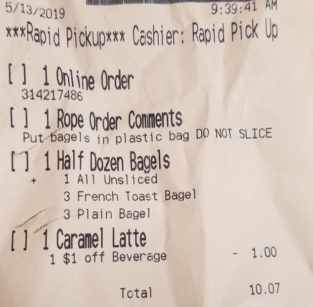 However, on one occasion I put my order in for scrambled egg on my sandwich instead of the round egg that they usually put on it. I entered this information based on customized settings on the website, so clearly this option was available. Also, for more than 6 times now I have ordered bagels and selected the option for them to be UNSLICED, set they do not read or insist on slicing them anyway. I usually slice my bagels differently or on my own due to my bagels tasting like onion and garlic from the bagel slicing machine.