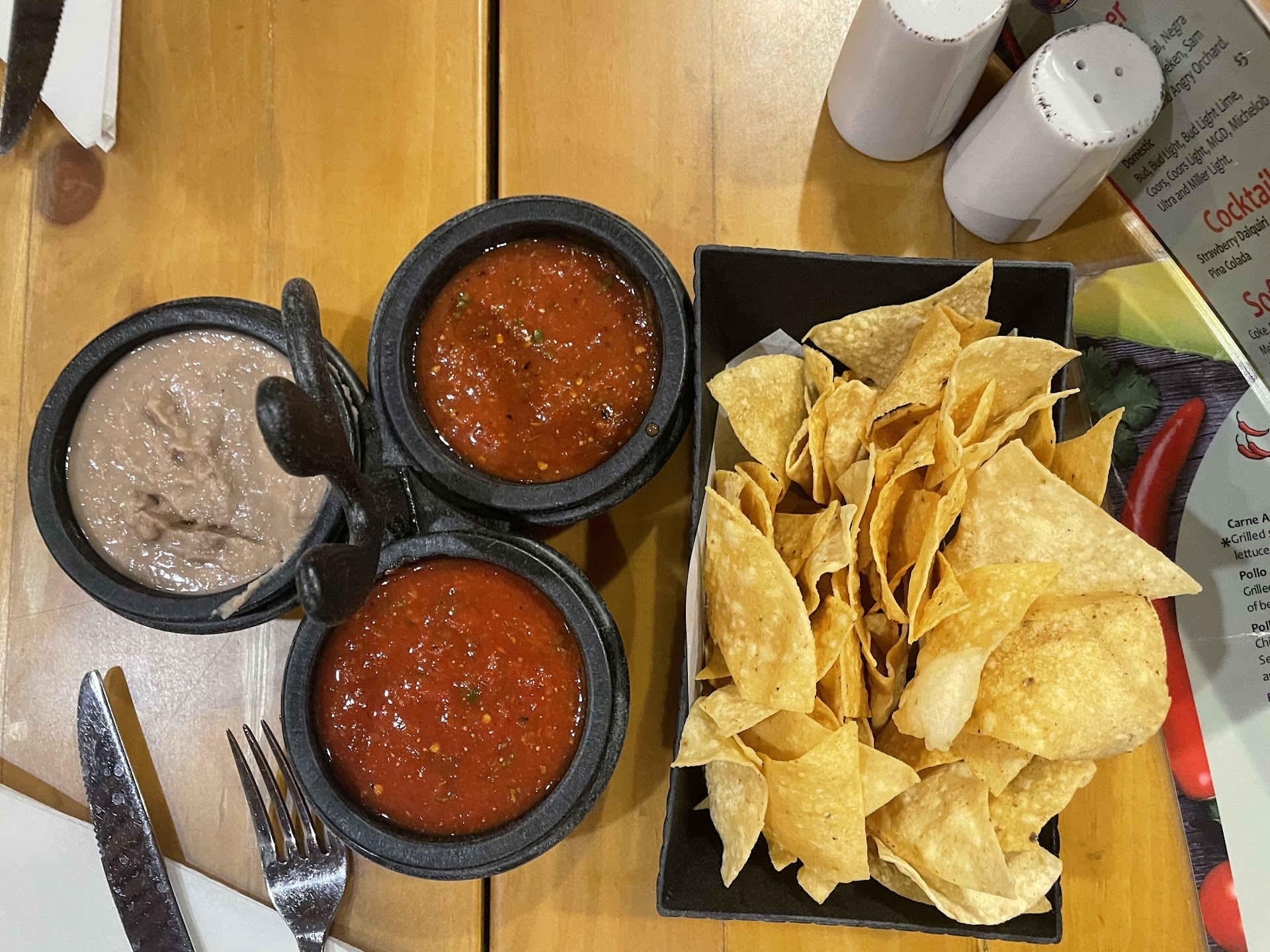 We were immediately served chips, with 2 different salsas- one that is hotter than the other. Be careful it sneaks up on you the more you eat! Both were tasty. I was very impressed with the complimentary bean dip included with the chips and salsas.