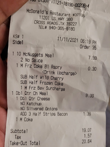 I must say that I am never going to eat at this McDonald's again! My daughter wanted french fries the evening of July 14th so I went through the drive-thru approximately at 10:45. I was hungry also and I have really never eaten their food so I said what the heck, I will try their chicken nuggets. We get home and my daughter is eating her french fries and I start eating the six piece chicken nugget and the second nugget that I ate I noticed it was a little extra crunchy. I thought it was just the breading because I noticed that some of it was kind of over cooked. So I didn't really think anything of it until my throat got kind of Scratchy on the right hand side. Then I took another bite and when I took that bike, I noticed there were actually bones in the chicken nugget I looked down pulled one out of my mouth and pull the remaining bones out of the chicken nugget. So immediately after that I called McDonalds at that time it was probably around 11 o'clock or so 11:15 and it would no one would pick up the phone. It just went straight to voicemail I tried to call several times. So the next morning and I called and I spoke with the manager hey Zeus and he apologized for not answering the phone and he was kept asking me to send pictures and the receipt so I did that. And then he also stated he wanted me to come fill out some paperwork so I came and got the paperwork and nobody tried to you know offer me free food or compensate me I mean. Luckily my daughter she wanted to actually taste the chicken nugget and something told me to say no and so luckily she didn't taste it because she would have had the bone swallow the bone writing gotten her throat scratch like I did. I went to the doctor and they said yes it's scratched and irritated and red. Luckily I have some antibiotics from several months ago and me being a nurse I kind of was proactive and started taking those antibiotics. Needless to say I got phone calls from the insurance company and they're stating that unless they can find fault with McDonald's then basically my claim will be denied because it would be the supplier's fault and all they were basically be doing is a quality control from now on to make sure that there are no bones or gristle or fragments of anything in their chicken nuggets. Which is really not satisfactory to me due to the fact that I did swallow a bone and I did have to go to the doctor and I did have to pay a copay and they are not willing to reimburse me for my pain and discomfort and me having to come out of my pocket to go to the doctor. And then now I would really be pissed off coming to find out that if my daughter headache eating the chicken nugget that there were no beer no resolution as well so I am never eating at that McDonald's again and I am never taking my daughter to that McDonald's again and I do not recommend you all take your family friends to this McDonald's off of 380. I would prefer to go to Chick-fil-A and I will be going to Chick-fil-A from now on if I want some...