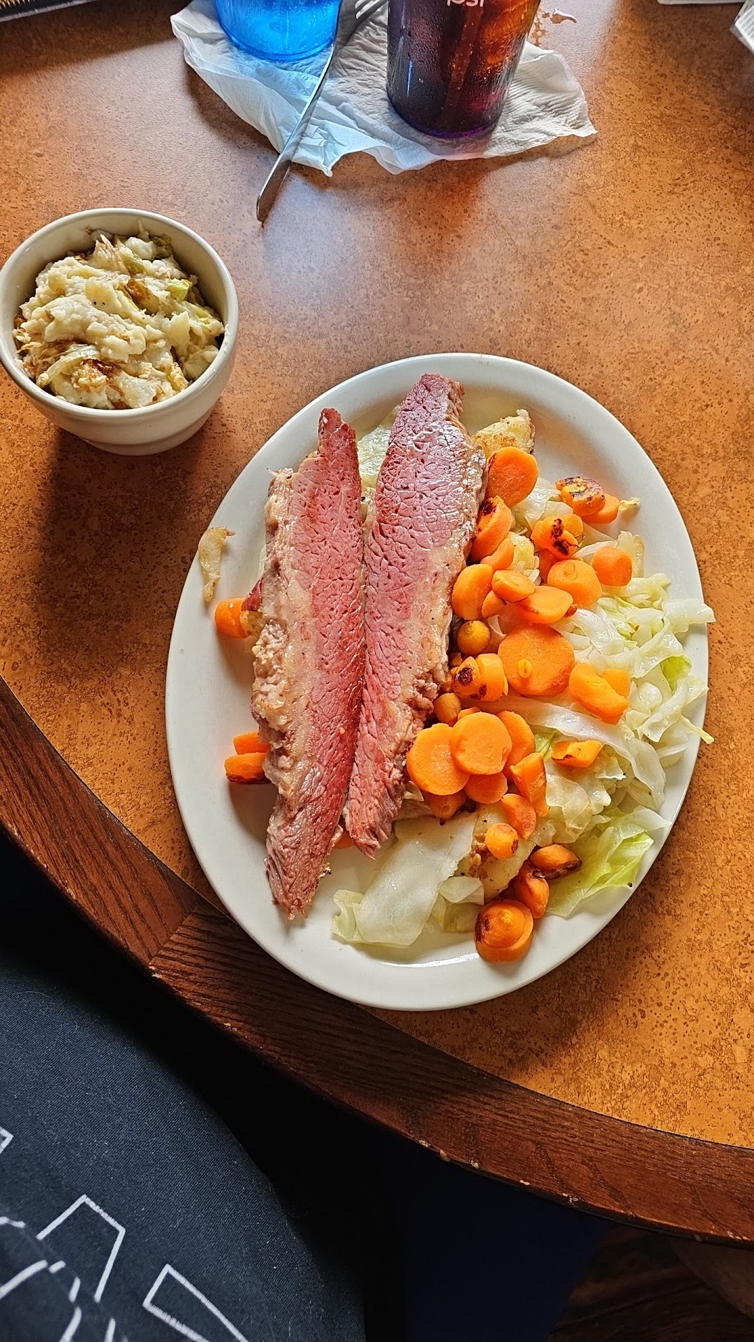 If you have not been here yet, you HAVE to try this place. We got in immediately. The service is amazing. We had Lisa as a server and she was great! She was knowledgeable about the menu and very helpful! We ordered the fried green tomatoes with homemade pimento cheese. 🔥! I don't even like tomatoes and I ate them up! They were fried perfectly and the pimento cheese was delicious. I didn't get a picture but do me a favor and order them! I ordered the Corned Beef and Cabbage, Potatoes, and Carrots. The corned beef was seasoned so perfectly and they give you two big slabs of it. The cabbage was a little bland so I added some salt and pepper. The carrots were sweet and cooked perfectly. The potatoes were amazingly buttery and melted in your mouth. I also tried something called colcannon and it was one of the BEST things I've ever had in my entire life! It is described as mashed potatoes with cabbage onions milk and butter and holy crap it was so so good! The experience was delightful. My friends got burgers and said they were delicious! I also tried a french fry they were so crispy and seasoned to perfection! We will...
