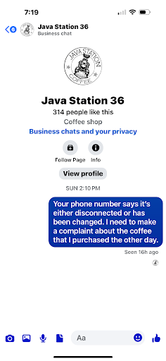 I was excited to get a coffee shop in our townā¦.Sadly, I was very disappointed when I got my $8 coffeeā¦.I ordered my drink on my way to work, got on the highway and took my first (and only) drink. It tasted awful š and within a couple minutes my stomach began feeling sick. Needless to say, I put the entire drink in the trash. I attempted to contact the shop unsuccessfully, called Java Station 56 for the number and it said it was disconnected or changed. I called 56 back to verify I didnāt put it in wrong, which I hadnāt. I was then told to reach out via Facebookā¦.ugh So frustrating, but I did. I had not heard anything back so I just checked my messenger and it shows that it was read 16 hours ago with zero response. I then checked the info section and lo and beholdā¦.The phone number has been updated! Why would you not respond to the message with the correct phone number, or even say you updated your contact information? Because I said that I needed to make a complaint? That is extremely poor customer service; therefore, I will never be back. I can go to Starbucks, Dunkin or 7...