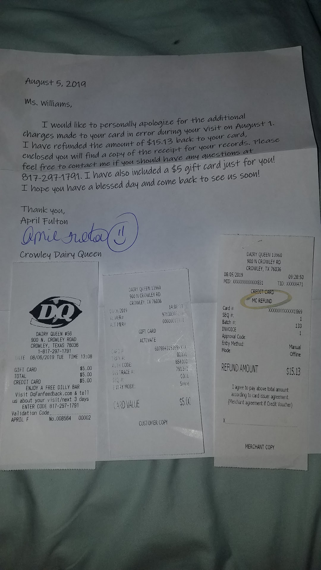 Read moreI waited to review this location because I really love Dairy Queen. Tonight was the final straw. I will never return to this location. Here is the rundown of my past 5 visits over the last 2 months.... any time we order food we are told to pull around and wait in the front and they will bring it out no matter if there are no cars behind us or if there are 3+ and there is always at least a 30 minute wait if it's peak times or not. The food is never fantastic, it's just mediocre at best but again I like DQ. Anyway..tonight We get there and we order food and it's ready in under 5 minutes!!! I was excited! Granted I did have to repeat myself 5 times since like always their speaker is crappy and I asked for extra mayo on my chicken sandwich and they said it don't come with mayo. I said can I add it to it? They said yes and I said ok extra mayo please and they remind me it doesn't come with mayo. I guess the concept of asking for two things at once... add mayo and put extra... was beyond their comprehension because I got what could be described as a light smear on it only (pics included). Then.... I discovered why our food was so fast. It must have been cooked hours earlier because the chicken was hard and tasted burned and the cheese on the burger was solid and not even starting to melt as the patty was ice cold. The fries were like cardboard. We considered taking it back but I never want to risk someone spitting in my food so I just tossed it and we went to Nicky D's out on 377. Go to the Burleson DQ as it's much cleaner and the food is fresh and fast. I think the 5 star reviews are a fluke and maybe the 1 visit these reviewers took was like a lotto win and they managed to...