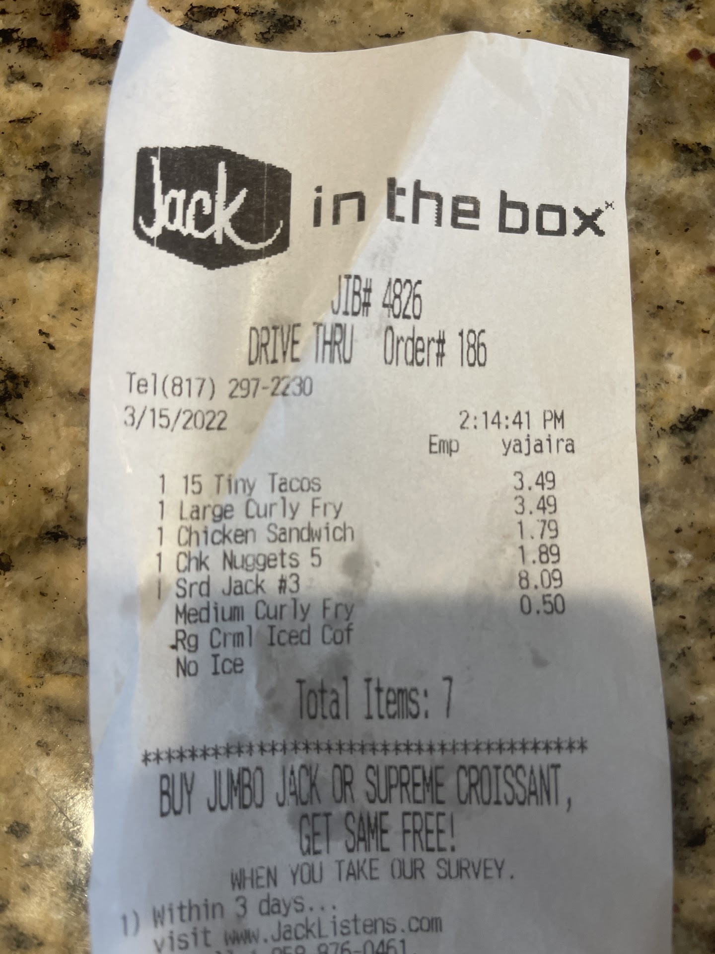 Read moreUPDATE: I did call corporate and let them know about my experience here. They will be sending me some type of coupon. Once I recieve it, I'll be using it at this same Jack in the box. Hopefully that experience will be better and I'll be able to give this restaurant a 5 star rating again.