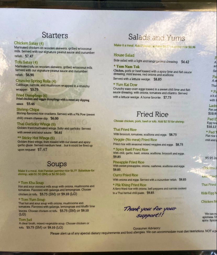 Read moreGreat food- definitely deserving of their 4.4 rating. It is great prices as well. We got the Crunchy Spring Rolls, Spicy Basil Fried Rice with beef and shrimp, and the Pad Kee-mow (Drunken Noodles) with Shrimp. It was so delicious, flavorful, and fresh. Also, a good serving size to where we were full and had leftovers. We ordered the meals extra spicy, we definitely tasted the spice but I wouldnât say it is extra spicy. We eat a lot of extremely spicy food so we are probably just immune. Wish I took a picture of the food to show you all but we smashed đ I definitely will next time. This will be my go-to Thai place when I am in the area. I will have to try the macaron ice cream sandwiches as well. Based on the other Thai and Asian restaurants Iâve been to, I wouldnât say they are completely authentic but I donât care since I went only for some food and not the experience. I did include pictures of the menu for your reference since the online ordering didnât include...