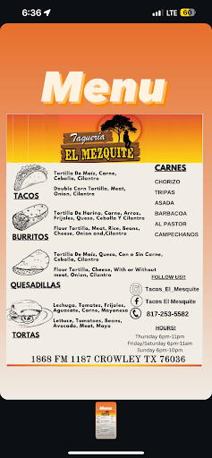 Tacos El Mesquite, the food truck sensation, is a true delight for anyone craving authentic Mexican flavors on the go. Parked in prime locations, this mobile gem serves up some of the best tacos you'll find anywhere. Picture this: juicy meats grilled to perfection, nestled in warm tortillas and topped with fresh, zesty garnishes. Each bite is a flavor explosion! Whether you're a taco connoisseur or just looking for a tasty meal, Tacos El Mesquite delivers the goods. And the best part? You can enjoy these mouthwatering treats wherever the truck roams, bringing joy to taco lovers...