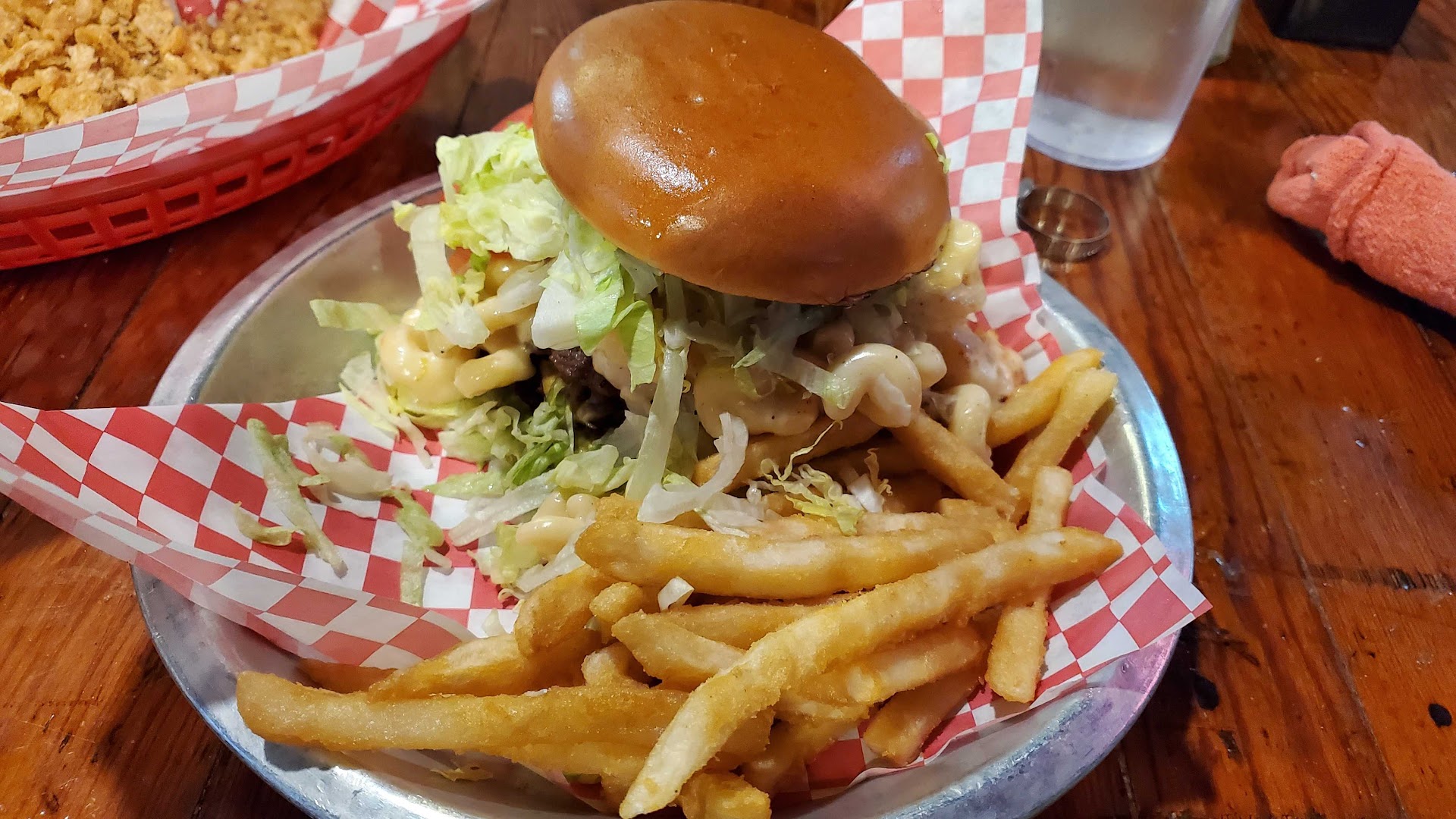 Read moreLet me start with, I'd really like to give this 5-stars, but had a bad experience the other night. I will definitely be going back and hoping this improves. This was my second visit to the restaurant and it was rather busy, we anticipated that, there were only two of us and they offered us a spot at the bar, which we accepted. We sat down and for 20 minutes, nobody acknowledged us. It was getting a bit awkward sitting there, people on both our left and right were getting attention, but it was like we were invisible. Even the owner poured a few drinks directly in front of me and didn't seem to notice that we were sitting there with no drinks, or anything... I finally flagged down one of the waitresses, Dawn, and she was super helpful. She got a waitress assigned to us and things went spectacular from there. The food is great, and the staff is super friendly, once the know you are there. The menu is full of all kinds of great items, which I couldn't really choose, so I opted for the Mystery Burger. If you our adventurous and not picky about what you eat, give this a try! I had know idea what to expect and would have never imagined what I got. It was 3/4lb of beef, which is standard for the Mystery Burger, topped with a Shrimp Mac and Cheese! And we aren't talking about a couple of little shrimp, there were at least 6 LARGE and very tasty shrimp. A bit messy, but wonderful! My wife ordered shrimp as well, and they were some of the best shrimp she's had away from the coast. Definitely try out their remoulade sauce with the shrimp, it was excellent.