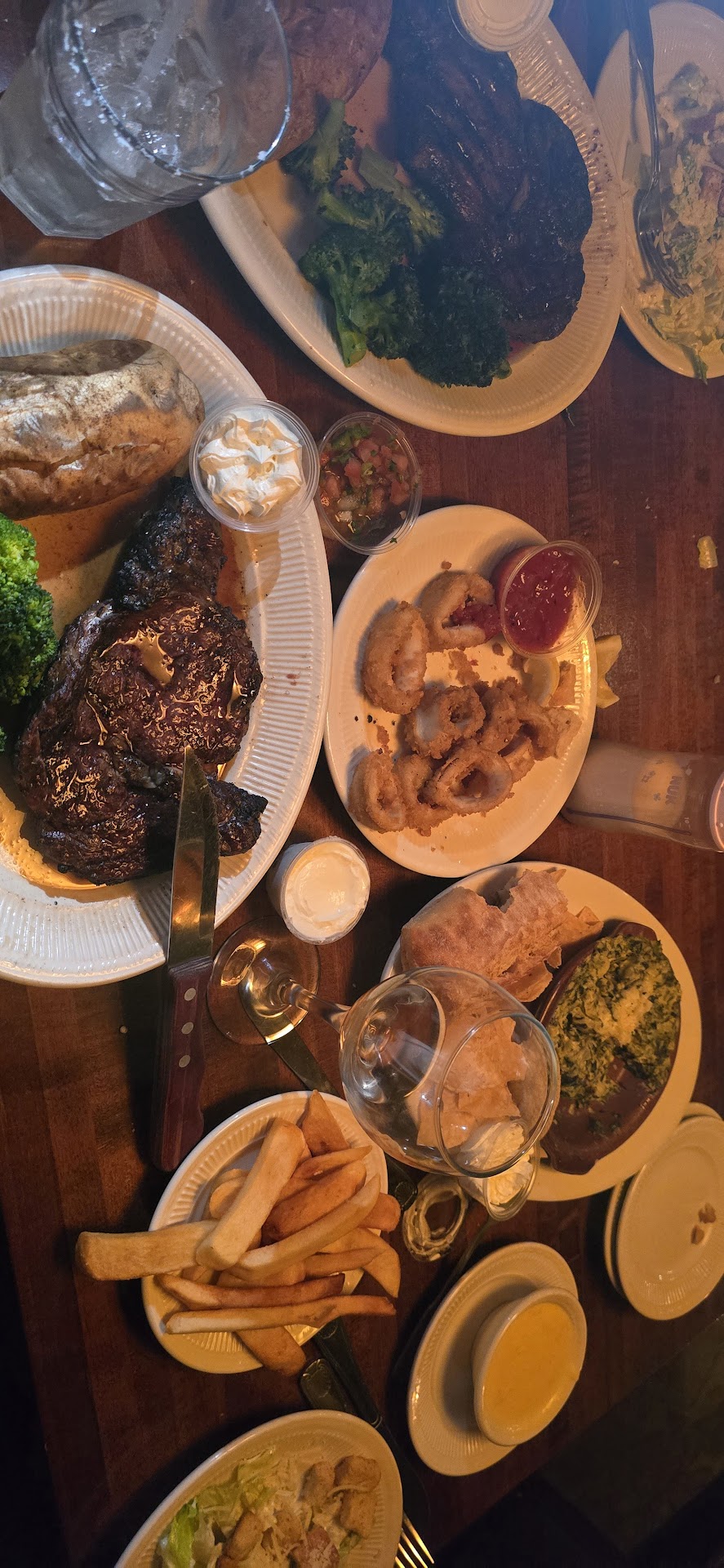 For the main course, we all ordered the Filet, and it was cooked to perfection—tender, juicy, and absolutely delicious. The meal started with some incredible soup—two of us had the Split Pea, which was out of this world, and one had the Baked French Onion Soup, which was rich and cheesy. The housemade ranch dressing on our salads was also a standout. And let’s not forget the perfectly sautéed broccoli and baked potatoes that came with the steak—everything was just top-tier.