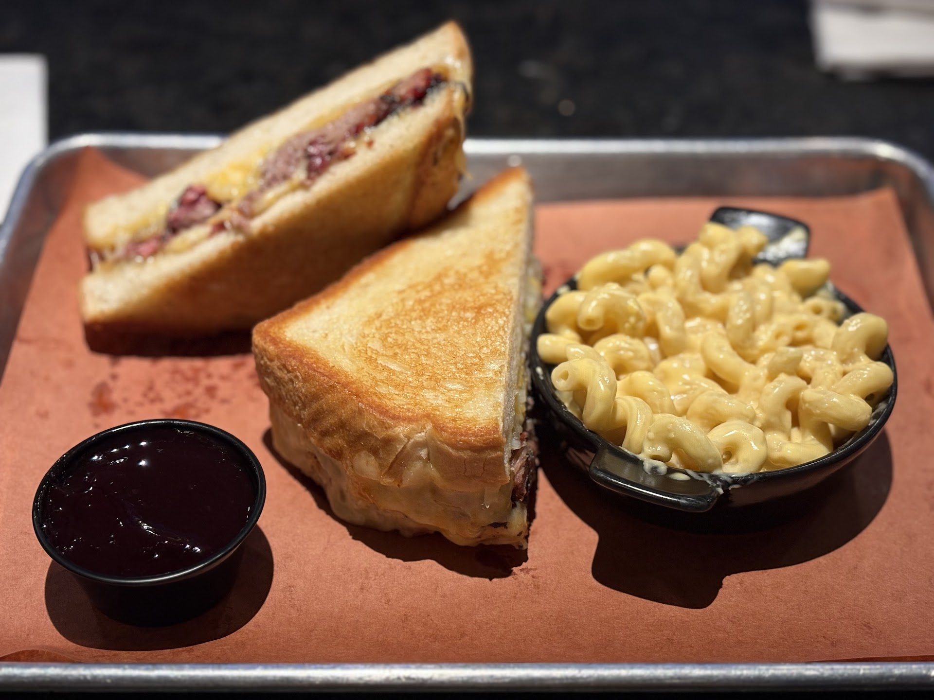 Enter the Brisket Grilled Cheese—an absolute game-changer. This isn’t just any grilled cheese; it’s indulgence on another level. Melted cheddar jack and gruyere envelop tender, smoky chopped brisket, all nestled between perfectly toasted sourdough. But what truly ties it all together? The blueberry chipotle BBQ sauce for dipping—sweet, smoky, and just the right kick of heat to make each bite unforgettable.