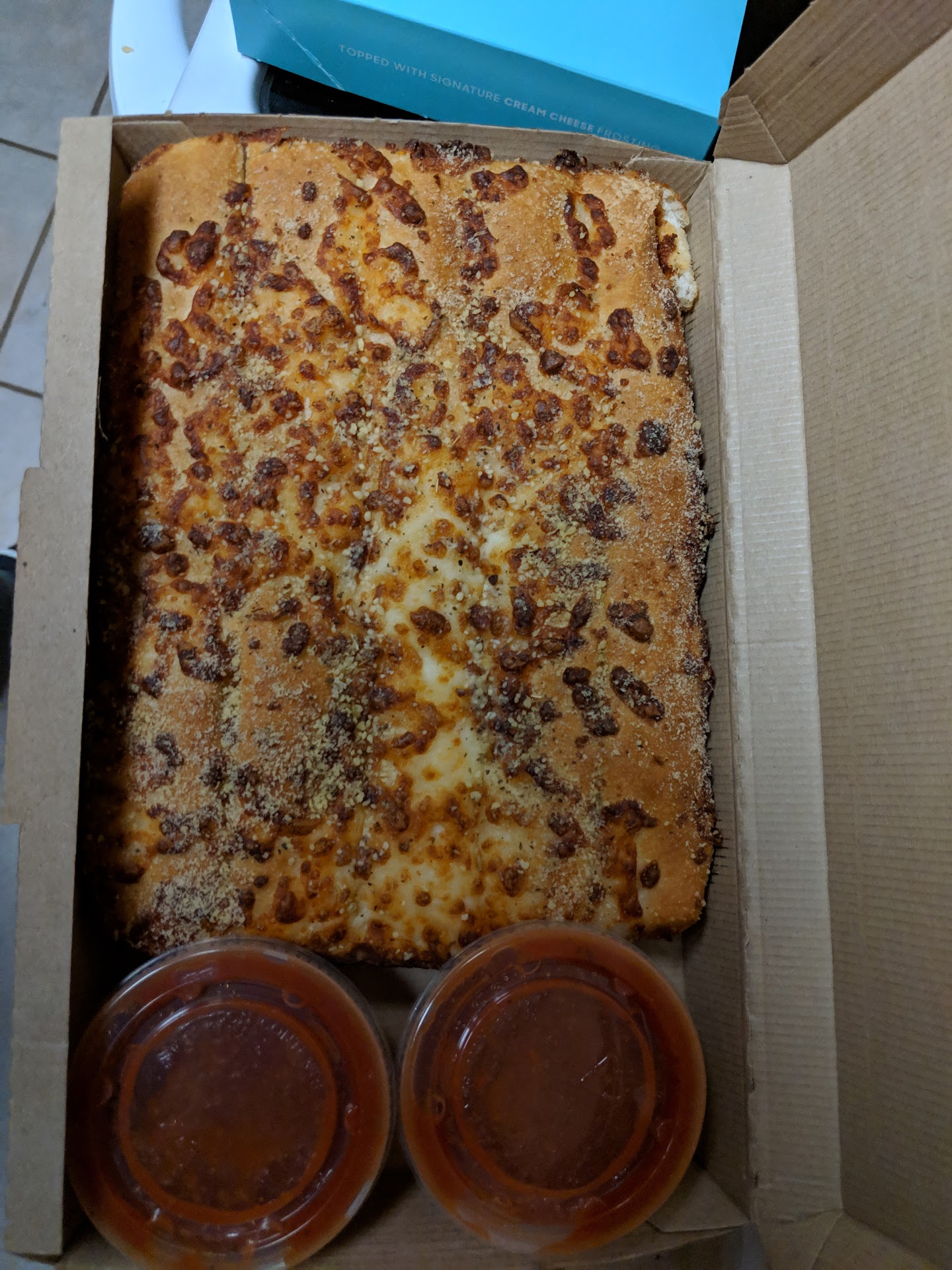 When I walked in to the restaurant no employees were visible not even in the kitchen. Waited about 3 minutes and finally a man walks up to the front counter so i told him my name and he verifies the order. Except when he repeats it back he did not say extra sauce. So I told him I wanted extra sauce. He said that would not be a problem because with the Detroit style pizza they put the sauce on after it comes out of the oven.