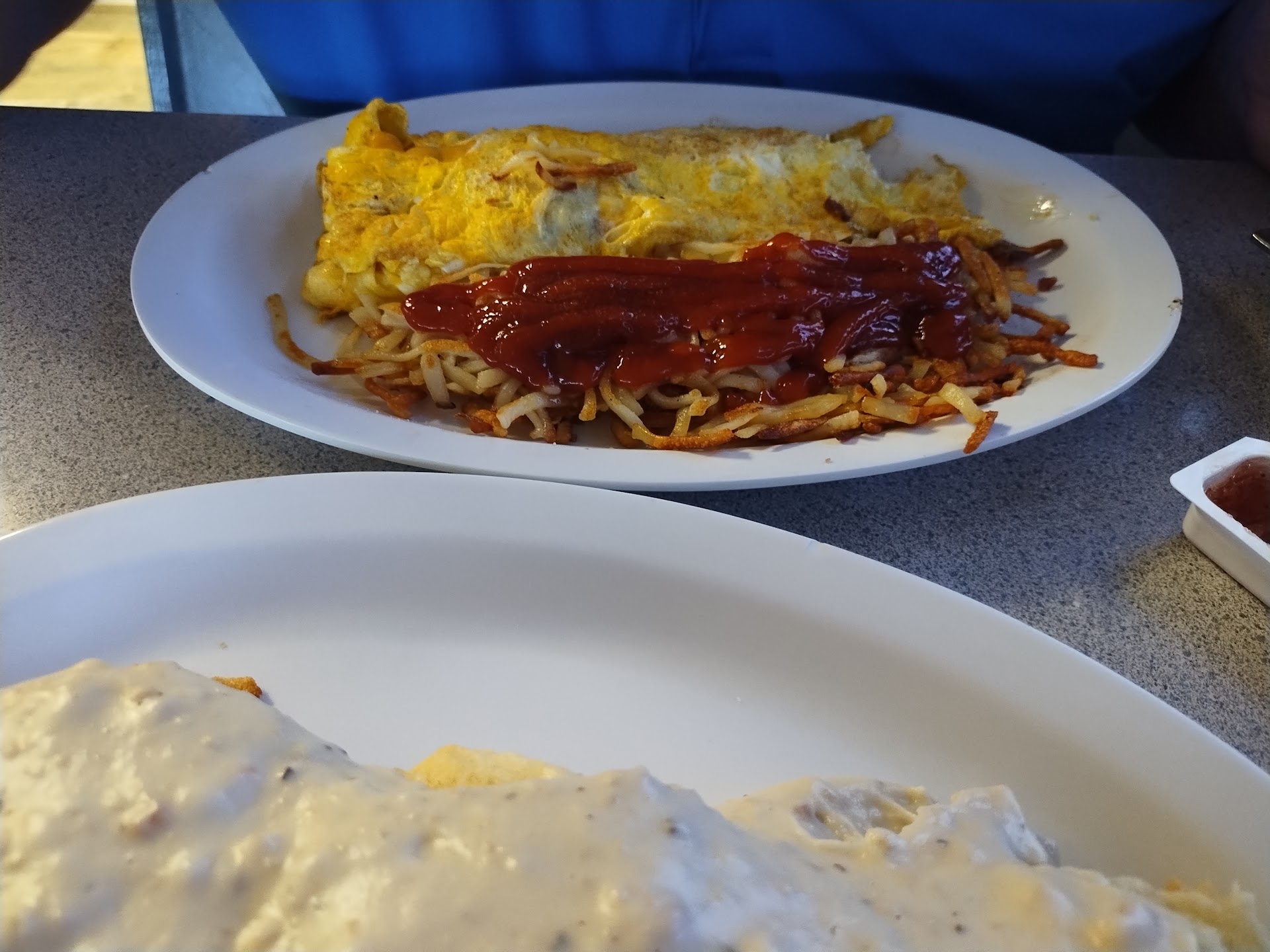 The eggs were scrambled fluffy and cook all the way through. So many restaurants we have been to have runny scrambled eggs. 🤢 The bacon 🥓 was indeed crispy without being burnt and I loved every bite. The home fries were delightfully seasoned, crispy on the edges and smothered inside. The biscuits were tender, fluffy inside, flakey outside, and such a wonderful butter 🧈 taste I really didn't need honey. The gravy on the biscuits and gravy had just a touch of too much salt, but was definitely homemade, and we both enjoyed the flavor. There wasn't so much salt that we couldn't eat it. It was just a smidge on the over salted line.
