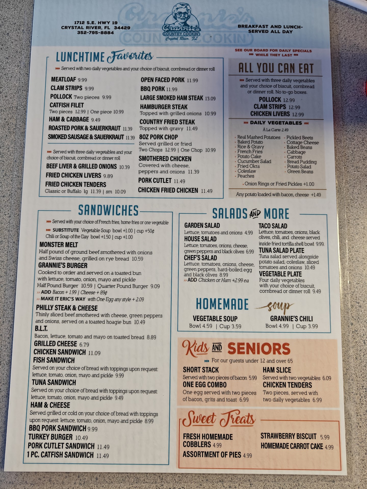 I finally got in to try Grannie's. This little gem has been in Crystal River for a very long time. Unfortunately, my schedule previously never met to with their open hours. Recently they changed it so they're open until 6pm on weekends and open 7 days a week (usually until 2pm). I went in because they didn't look to packed (if you've ever driven by, you know they're almost always packed), and today's special was listed as AUCE fried chicken. Sadly, when I cut there, they were out of chicken. They were very apologetic, and looking over the menu, I saw they offered AUCE pollock daily with 3 sides. I decided to go with fish. Their fish is served up fried, blackened, and I forget the third eat they prep it for you. I opted to start with the blackened. I had asked the server if they season it and then seat it on a flat to griddle. She said they did, and I was quite happy about this as I've been to one too many places that steam or bake it, then throw some seasoning on, trying to pass it off as blackened. I was very happy with my voice. Pollock is a flaky white fish that is very easy to over cook. Grannie's served it up right. It was hot, flaky, and moist with the right amount of seasoning seared on, and tasted quite delicious. I picked for my sides mashed potatoes, green beans, and cottage cheese. The mashed potatoes lacked a little bit of seasoning, and tasted like they were made from Idahoan spuds. The green beans were very hot and tasted great. Cottage cheese was.. well cottage cheese.