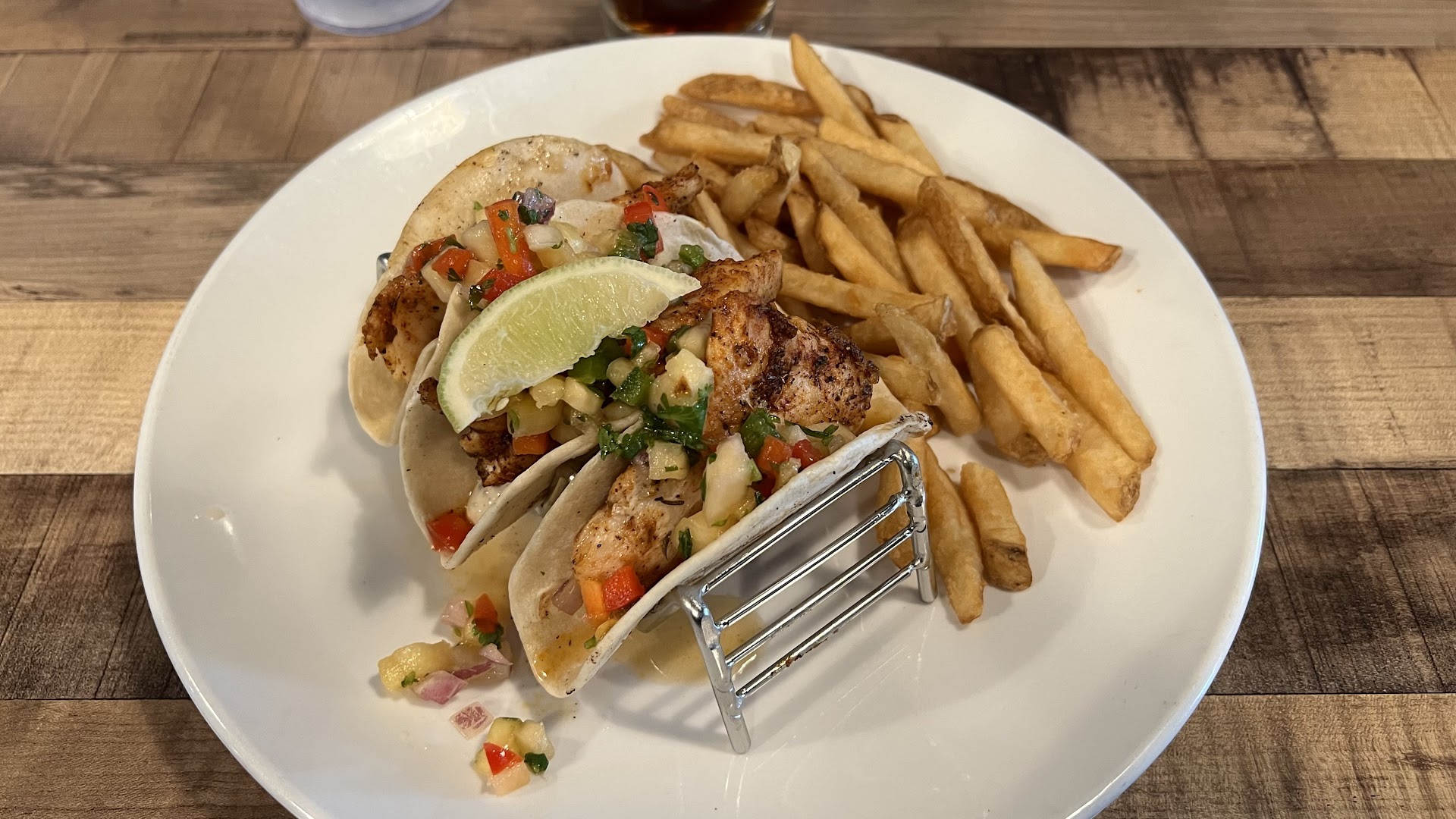 Read moreWe sat outside on actually a pretty warm day, but the ceiling fans and the marina breeze it was very comfortable! The King's Bay punch drink was delicious! Definitely would order this again! I had the Mahi Mahi tacos blackened they were really good, not very large, the slaw on them added a really great flavor! Others in our party had Cobb salad with add on blackened chicken, Caesar salad with blackened chicken, and a Shrimp Po Boy. The Po Boy and Mahi tacos come with fries. Those were actually some of the best fries we ever had and they have malt vinegar so of course I made them into salt and vinegar fries! The rest of my party was from Denver, Colorado and they actually loved the place. Which was good because they are picky and I picked it! So win win! Really wanted to try their Key Lime Pie and Peanut Butter pie afterwards but literally had no room. So next time! The restaurant is hidden inside a marina parking and Port Marina Motel you go through a tunnel to the restaurant on the water with a gift shop and indoor dining or outside, plus an indoor and outdoor bar. Outdoor bar is past the restaurant entrance you keep walking past the Manatee tours building and you come to another bar and outdoor covered dining great for boaters! My lunch was 30, the other 3 with drinks was $69. So really based on eating out lately was pretty decent when some fast food places could cost you $50 for three small meals. The service was great, staff was friendly, menu full of options for all palate preferences. Definitely a great place for locals or tourists or even snowbirds. I mention the motel because you do feel like you may be in the wrong place. I assure you that you are not! Tunnel is to the right of the motel office. Sorry didnt get many pics of food but got the Mahi last taco there is 3 and the...
