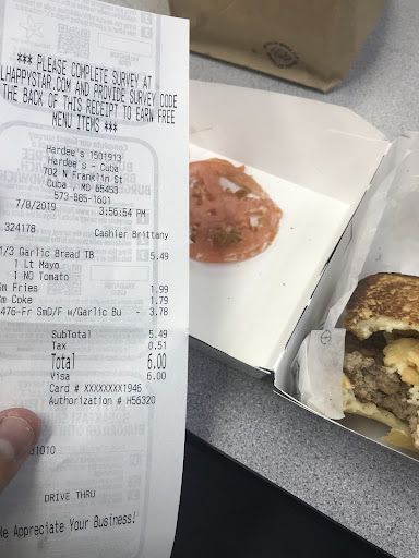 Read moreSometimes life gets busy and that's where Hardee's comes in. We've eaten there a few times and never had a problem until tonight . The store is pretty clean and most of the staff is pretty friendly. We've only encountered one rude employee and we haven't seen her in a while. The food is nothing fancy, but it is usually hot , fairly fresh and reasonably priced.. Husband went and got two real meal deals (each meal has one cheeseburger , one chicken sandwich and one order of fries). He paid extra for cheese on each of the chicken sandwiches . Once home we realized the cheese never got put on the sandwiches . I called Hardees, explained the problem and was told that we could come by anytime and they would remake the entire meal for us free of charge. Problem solved. We won't make this our regular hang out , but it will do...