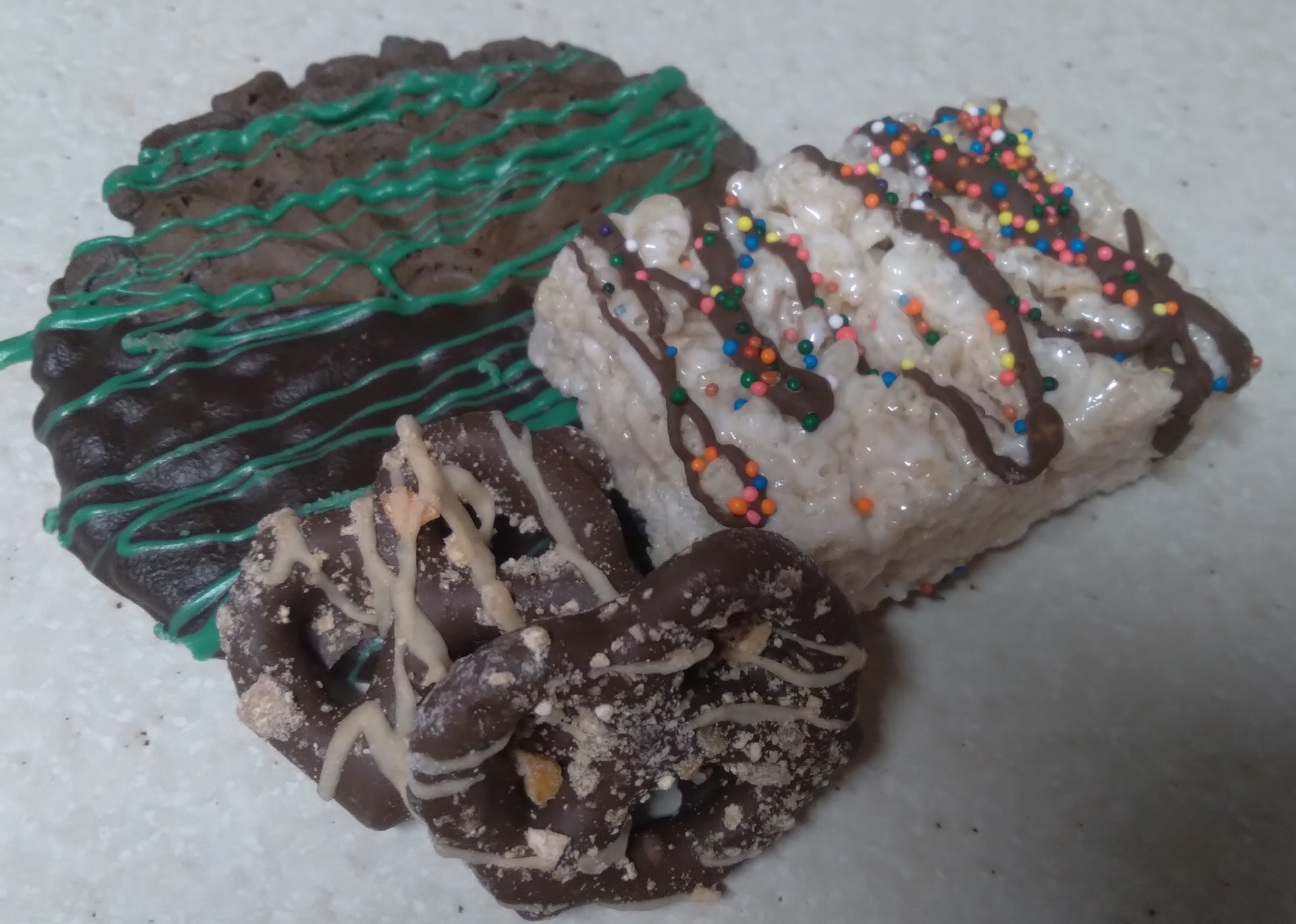 I bought some crispie treats, butterfinger flavored chocolate covered pretzels, and andes candies flavored pizzelles. The crispies and the pizzelles are fabulous. The pretzels though, not that they are bad, but the have too much chocolate. I know how that sounds. The chocolate is too thick so you can't taste the saltiness of the pretzel. The butterfinger flavor it definitely there, but they were disappointing with the pretzel flavor.