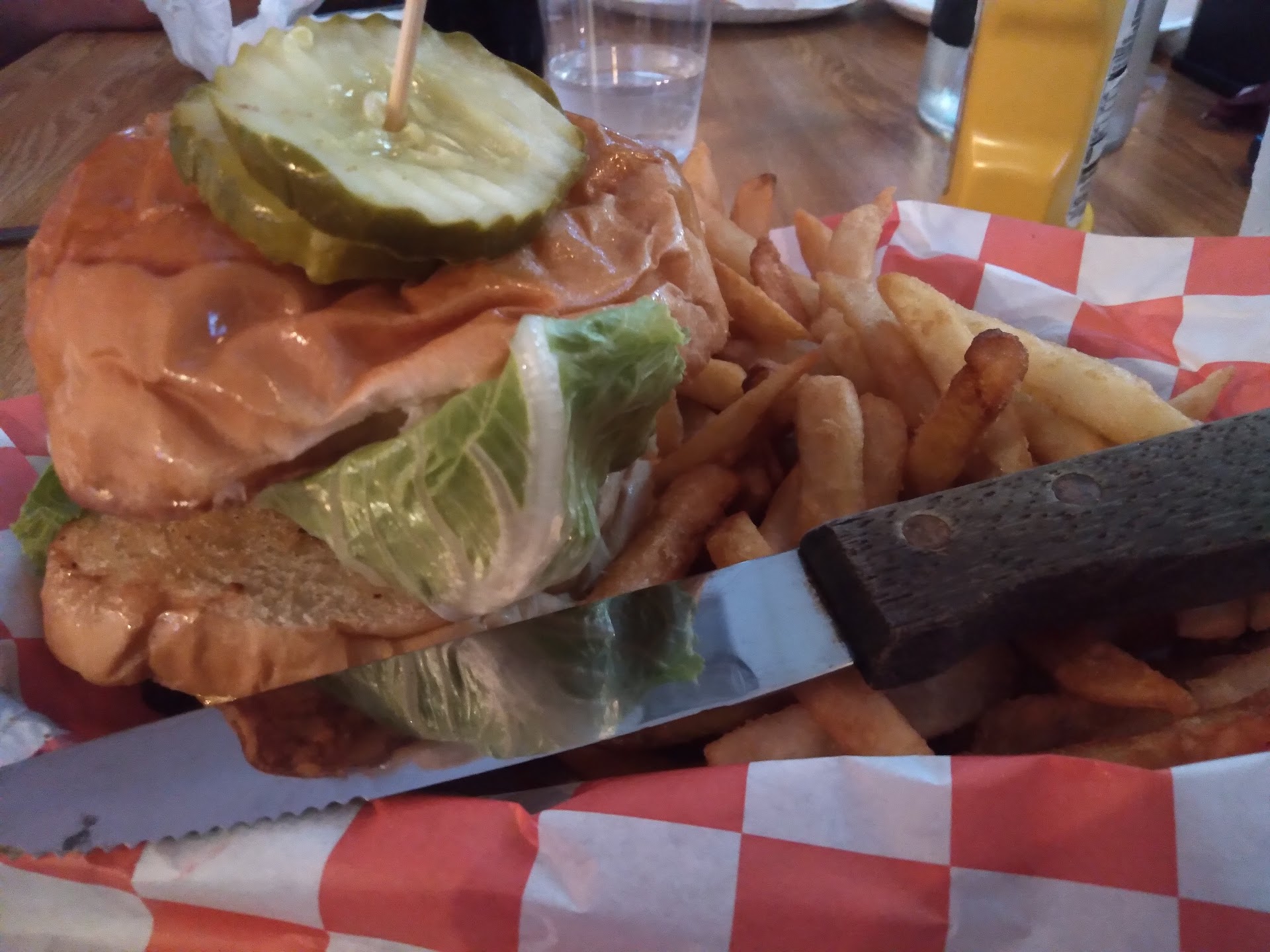 We probably should have known after the first 10 minutes of arriving that the experience wouldn’t be good. We finished our first drinks by the time our server returned to take our food order. We then proceeded to wait 40 minutes until she returned to tell us our order was delayed. We tried to catch her attention numerous times to ask, but she didn’t even look at our table. In the meantime, we saw several orders come and go for the staff, who were standing around a table eating and chatting. We saw random food go out presumably for regulars; there was a definite feel of us being “outsiders”, which maybe contributed to the poor service. In that 40 minutes, we didn’t even receive our appetizer of Frickles (fried pickles). When our server returned to tell us the food was delayed, she tried to offer us shots, which we found somewhat inappropriate (she ended up comping two of our drinks, to her credit). At that point we were starving and only wanted an explanation of why our food was taking so long in an empty restaurant. I’m not sure why they couldn’t have brought out our appetizer at least, as they were perfectly capable of making appetizers for the staff during this time.