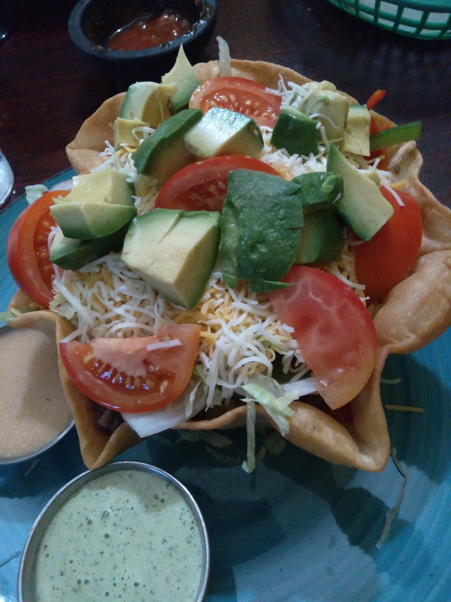 The food is REALLY good. AND very reasonably priced. I ordered the steak taco salad and it was packed very nicely with STEAK, instead of mostly lettuce. Very nice balance. Fresh ingredients. SO much avocado. YUM. It comes with two sauces and the combination of the two is simply delicious. My friend ordered enchiladas and was very pleased with her choice.