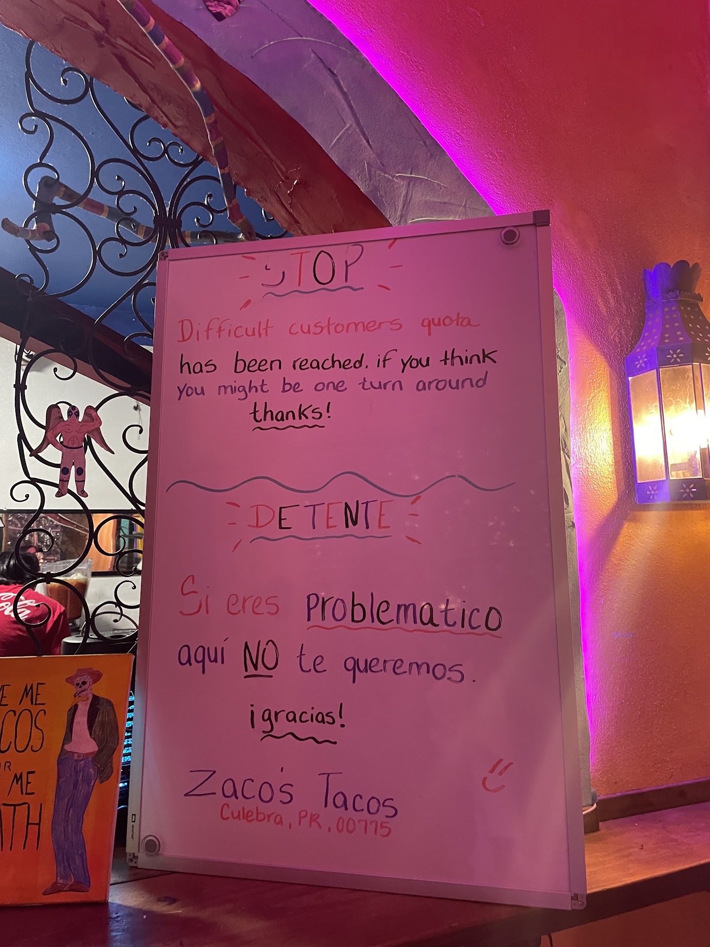 First time as a patron and I was excited to explore what the beautiful island of Culebra had to offer. Upon entry we were greeted by a very kind young man who instructed us to wait as our table was being prepared. No problem. After a few minutes we were led to our table by our waitress and this is where the experience went sour for me. She approached our table with attitude and annoyed as though she was upset for servicing us, as though we were BOTHERING her. No one ever told us to order from the menu in the front, so we wasted 15 minutes waiting around. After getting over that confusion she began to take our drink order and appetizers but proceeded to walk away in the MIDDLE of us ordering. Iâm starting to think this child of a woman has no manners and was poorly trained. She came back after AWHILE to take our main dish order, this is where I spoke up to let her know to take all our orders down because I didnât want to bother her any longer and to help make it easier for her seeing how she probably gets lost on the way to the kitchen by the way she takes so long to come back. There were only three other tables there and she had no problem attending to them and being kind to them. I started to sense she was mistreating us with her passive aggressiveness because we were not Hispanic. Because how dare other people come into a place of business expecting the bare minimum. She gave us 3 napkins for a party of 8. I had to wave her down to give us more napkins, maybe she canât see well or canât count well enough or she lacked basic decency. I just know she was intentional in her rude behavior because she had no problem being polite to the other tables.