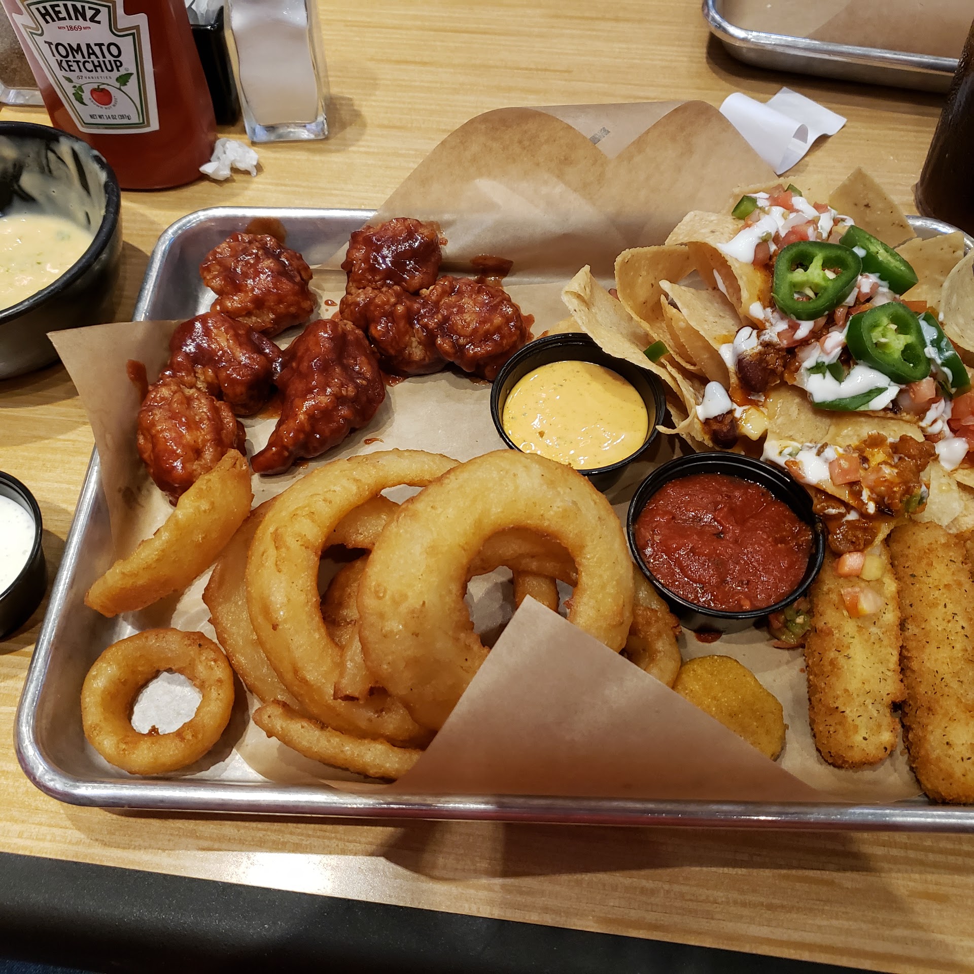 Read moreWhy three stars? Shrinkflation and incredibly slow (cook) service. We got there about 8:30 on a Monday night. The app, Ultimate Nachos, was far from "ultimate". Toppings didn't come close to covering the nachos. Very little cheese and maybe two small sliced jalapenos. The salsa and chili came in condiment sized plastics cups ($13). The staff that delivered the nachos told us she would bring us silverware. We didn't see her again. The main courses were all good (we agreed- unanimously); 15 wings (three different sauces), Asian zing cauliflower, bacon smash hatch chili burger. However, the wait was unsatisfactory. Our food arrived after a handful of apologies for the wait (we were also issued apologies at the end of the evening). Paying caused further delay (more waiting on the check to be picked up). There was nothing slowing the process except staff. The place was not packed. In fact, there only seemed to be a few patrons total (five total tables). One of us (party of three) commented she had never heard a BWs so quite. Again, the food was tasty (the beef patties were not hot- something you might expect after waiting nearly an hour for it to arrive- the grilled veggies on the burger were hot). All in all, a bit disappointed. With prices going up and supply going down, it is sad to see effort disregarded and corporate cut backs negatively affecting the experience. I want to be clear, the food was tasty and the waiter was excellent. It took entirely too long. We were out a few...