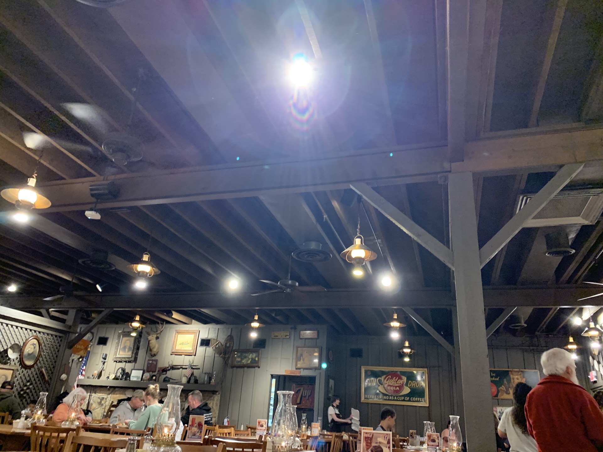 Read moreThe place was pretty packed at 9pm on a Friday. Told there was a 20-minute wait, which turned out to be 3 minutes. Table and chairs were covered in crumbs and something sticky. They close at 11pm, and were out of chicken pot pie at 9pm. Bummer. Lighting was rough at the table we were given, with three ceiling lights serving as painfully blinding spotlights directed at the area where we were seated. Not customer-friendly lighting at all, especially for people that intend to continue driving at night afterward. From past experience, I knew not to ask for a different table, or even a clean table as the last time we had asked, the hostess was fairly rude about it, and the request was denied even though at least a dozen other tables were available. The food ended up being pretty good - my wife said it was the best she's ever had at a Cracker Barrel - although it took about 4 more minutes to find out after the food was brought to the table, because it took that long to get silverware. The server, Nate, was okay when he was around, but that wasn't often, even after the 9pm rush was over. April 1st and New Year's history lesson story was great, but couldn't look at him for fear of burning out my retinas. The Cullman Cracker Barrel seems to have gotten the food right. It's everything else that could use some improvement to match. Look at the pictures. If you sit where we sat, bring sunglasses at night.