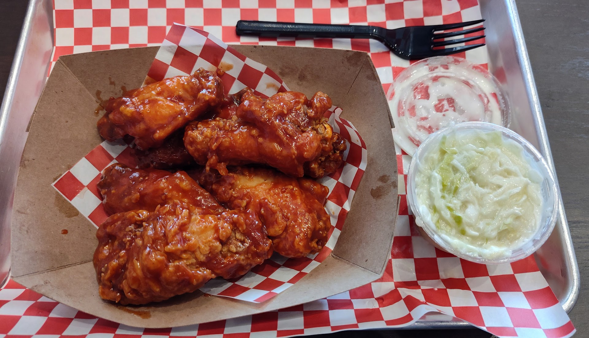 My wife ordered the Chicken Sando Jr with waffle fries and a drink I ordered the 6 jumbo wings with Cole slaw