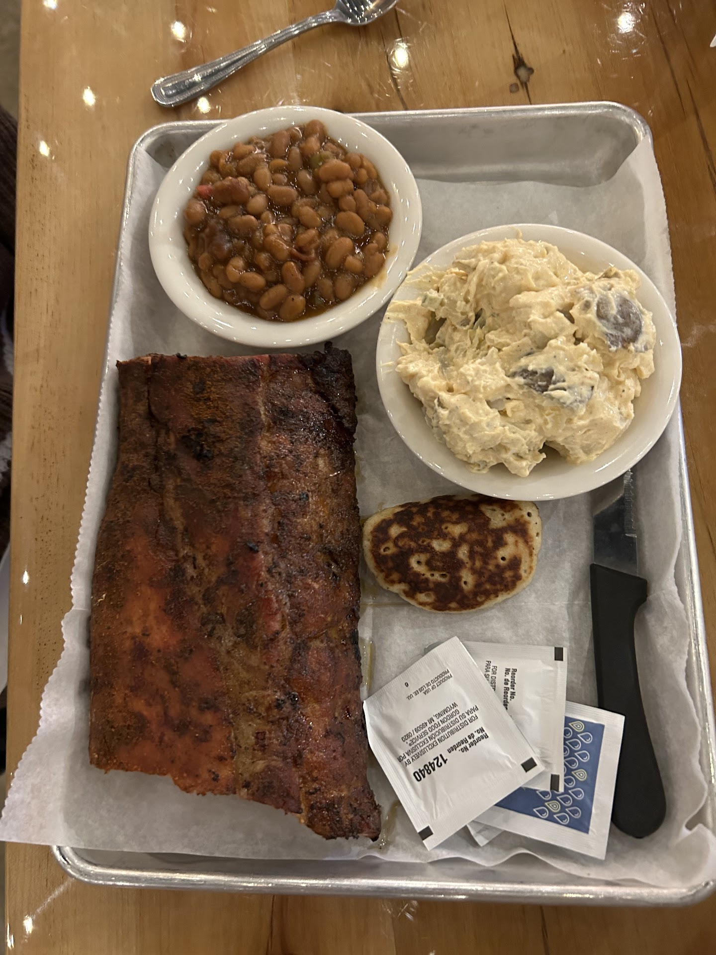 My wife got the baby back ribs with backed beans and potato salad. Ribs were not “baby back” in the traditional sense but she said they were excellent with a nice Smokey flavor. Only comment was they could have been a little more tender. But they needed no sauce to give you that BBQ taste. Baked beans were juicy and meaty. Potato salad looked like a combo or mayo and mustard, which made for a great combination!