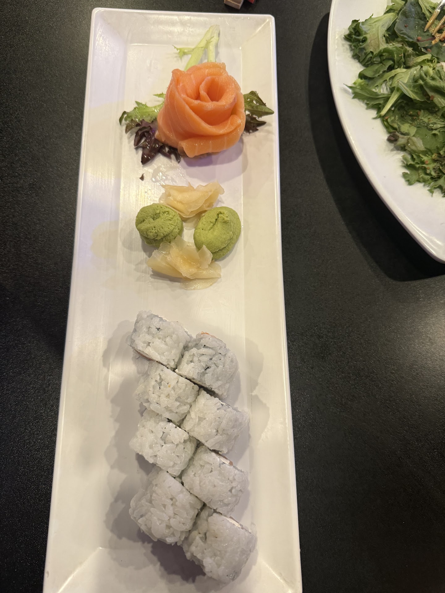 I empathized with the lone server who was managing all the tables and tending to the bar single-handedly during lunchtime. Despite her efforts, the pressure was noticeable, and it affected the overall experience. After waiting for 20 minutes for our sushi to arrive, I took matters into my own hands and approached idle team members to identify our plates. I even assisted in delivering ramekins to the neighboring table, which had been unintentionally neglected in their request.