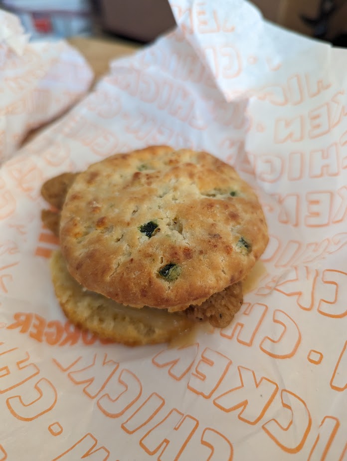 It's only been open 3 days, so I expected there to be a lot of cars there for breakfast; but it's almost 9am and maybe it's not so bad. Looks like only 7 or 8 cars ahead of me, not wound around the building as I was expecting, so I go ahead and get in line. Y 'all, it took me 40 minutes to get my food. I'm not expecting it be move like Chik-Fil-A, but this was ridiculous for such a short line on the first weekday after opening. Some staff would have helped; there was a guy working the window and what appeared to be the owner working. I'm assuming there was someone in the kitchen, but it was not the typical staffing of a fast food restaurant. Then, to top it off, I get home and there are jalapenos in one of my biscuits. There's a limited time menu item for jalapeno biscuits, and that might have been fine for someone who likes jalapenos, but I HATE jalapenos. I have worked fast food before, and I know these aren't mixed in with regular biscuits; if I had to guess, they ran out of regular ones and grabbed one of these to keep me from waiting any longer. I went by to try the new place out and I'm not one to eat at the same place all the time, but once Chik-Fil-A opens back up I can't see any reason to ever grace that drive through again, unless I need something before 5:30am. The food definitely wasn't good enough to deal with that kind of wait time; the biscuits were dry, the chicken was... well, a chicken strip, nothing especially tasty about it. And while the honey butter is a nice touch, you can't eat it without it getting a sticky mess everywhere, so it's not a great selection for eating while you are on your...