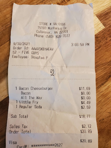 Read moreWe showed up at five guys in Culpeper about 45 minutes before they closed. The store was spotless and it was clear that if no one had walked through the door, they could have just shut everything down and walked out the door at the end of their shift. But they greeted us with friendly smiles, and cooked up our order perfectly and quickly! There wasn't even a hint that they were disappointed that we walked in, they treated us like they we're at the beginning of the shift rather than the stragglers who came in and undid all their pre-close cleaning. While I do understand that this is the way it should be, I understand that it often isn't. So hats off to five guys and their stellar employees, feeding tired travellers...