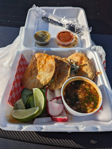 This awkwardly located food truck serves outstanding birria everything. From their tacos to consume, to even a burrito, their own take on birria will leave you wondering if you should have ordered seconds. Yes, yes you should. Is this place worth the visit? Of course. Though note a couple of things. They are across from the overpass that is neighborhood to perhaps 100 or more homeless, while they are usually harmless, it is something to be aware of. They do have a couple tables but my suggestion would be to grab your order to go. There are clear signs indicating that you should not park at the gas station directly next to the truck so parking is a bit difficult. The street on the right directly after them may offer some temporary parking on one side of the street. The other side is permit parking only, increasing difficulty. A dirt bike road through their dining area as we ate. It was weird, and dangerous, though no one was harmed due to the large space in that area. I believe they serve a purpose in this particular location, but would thrive if they moved to a better area. I will be going back to grab a...