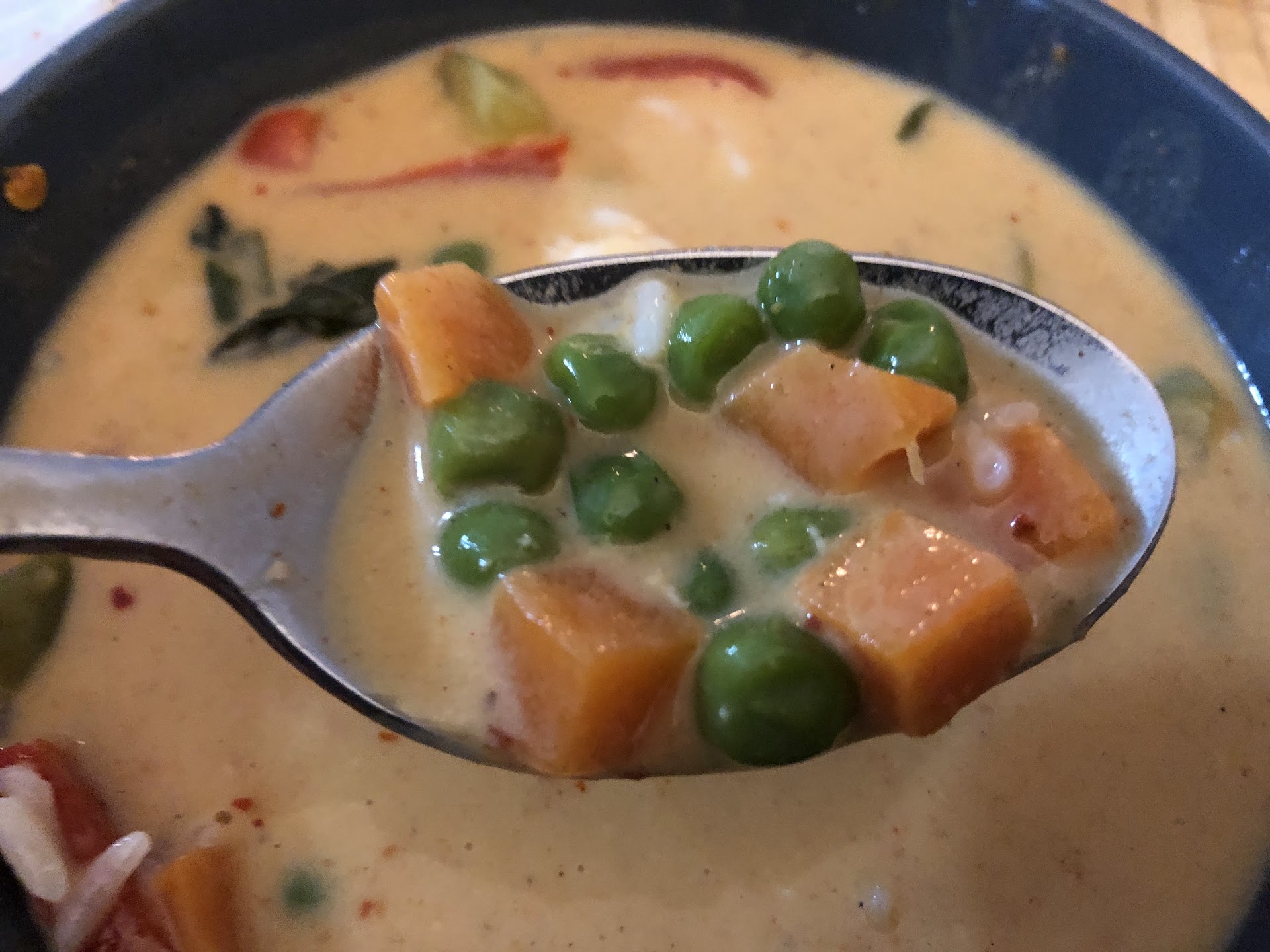 Panang Curry Medium- NOT SPICY, little flavor. Not much to it. My least favorite part of the dish was the FROZEN PEAS and CARROTS. Shrimp also seemed a bit dried out and rubbery.