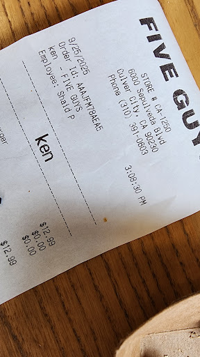 Note, I'm not reviewing the food itself, which is the same at every Five Guys location, at least the ones I've visited. Pretty good burger, and too many fries (which isn't a problem--just don't eat the ones you don't want, and they have three different sizes so if for some reason you love eating a pound of fries with your meal you can order a larger size than the small).