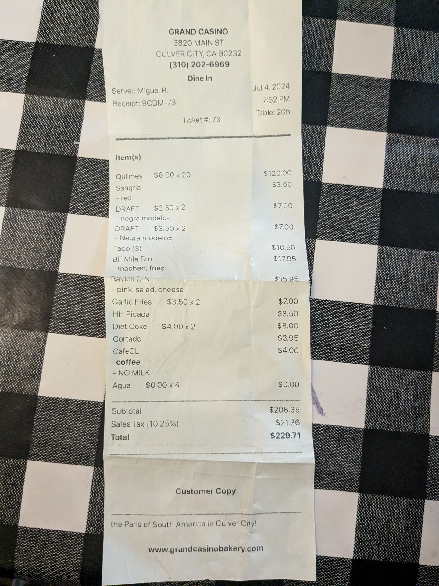 I took my little family to Anime-Con in downtown Los Angeles on July 4th. Even with my partnerâs challenge, we decided to leave the event early to Gran Casino for the Copa America game of Argentina⊠It was a restaurant on our way to Venice Beach to watch the 4th of July fireworks. A couple of friends showed up on our behalf due to the fact that the restaurant representative recommended that we show up early (First Come First Serve) ⊠Not only 2 of our friends showed up early, but so did we and half of our table was already yielding to a group of fans on the opposite team while the rest of the restaurant was empty. We arrived half an hour before kick off time and 1.5 hours before the end of happy hour⊠Obviously I wanted to treat my friends with drinks while I ordered food for my family. Not only did the server never come to our table for our requests, but had the audacity to complain to one of my guests who bought treats from the same restaurant and publicly humiliated him. Our server had a grin face towards Argentinians, so it begs the question, why is he working for an Argentinian restaurant?! My partner called the day before trying to make a reservation in hopes that she can share her culture to me, our family and friends, but I left with a bitter taste of the experience and I wouldnât recommend anyone to come here. I got overcharged by $90 dollars that I did not want to dispute to avoid conflict within my party. Our server was rude to all of us and waited up until 2 minutes after happy hour to serve us again after being absent for almost 40 minutes, and to my surprise that all of our drinks were charged after hour prices even when we ordered many drinks before the 6pm time frame⊠Iâm sure everyone has a different experience within restaurants, but for an Argentinian restaurant who are discriminative towards Argentinians should probably change their...