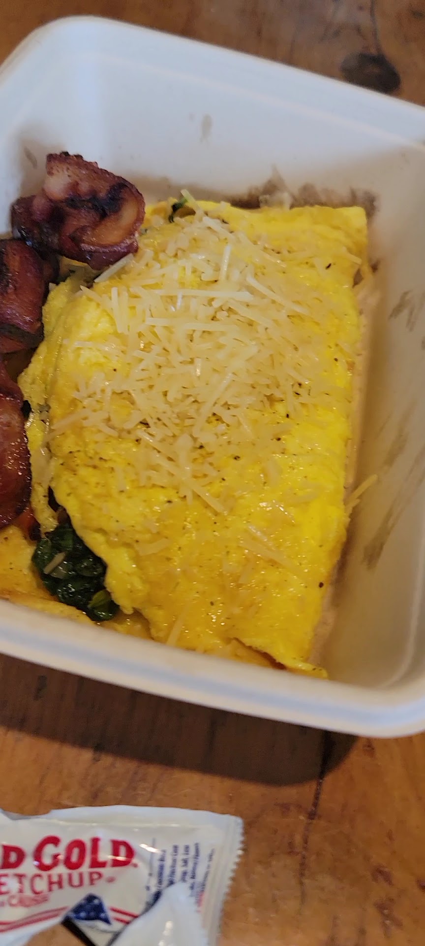 My husband ordered the spinach & mushroom omlete and he enjoyed it. It tasted delicious when I sampled it.