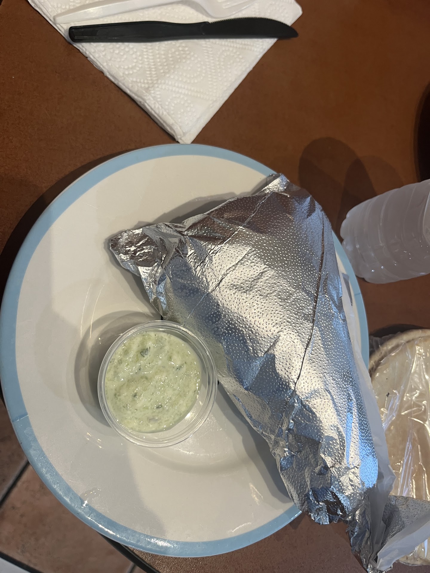 This gyro was life-changing. I found myself in the vicinity after a disappointing day of trying to patch a tire which led me across West LA to a tire shop down the street. I was hangry and disillusioned with the state of my day, which quickly went to waste quickly in the midst of my complications. This gyro sandwich is the redeeming factor of the past four hours of my existence. When I entered, I was confused by the lack of prices, menus, and... people. There was an older woman who met me with a warm smile and welcomed me in as if I were her own grandson. She quickly took my order, which left me gobsmacked when I saw that this, unbeforeseen-at-that-moment mystery gyro, would only cost a mere 11 dollars, including tax and a 20% tip. The woman quickly got to work and I witnessed her prepare my gyro with care and intention, shaving it carefully off the spit and garnishing it with a superb amount of toppings and delectable sauce. The gyro was fresh, tender, and satisfied my hangriness and impatience with ease. This is the definition of comfort food. The gyro was served on a random cutesy plate which completed the developing hole-in-the-wall restaurant discovery saga for me. I inhaled the sandwich so quickly it must have startled the woman. On the way out I thanked her for my meal, dropped my dishes off, and she told me: "have a wonderful night, until next time ." This spot epitomizes small business America in a way which no Greek chain (looking at you Daphne's and Luna Grill) will ever emulate. Bravo and I will...