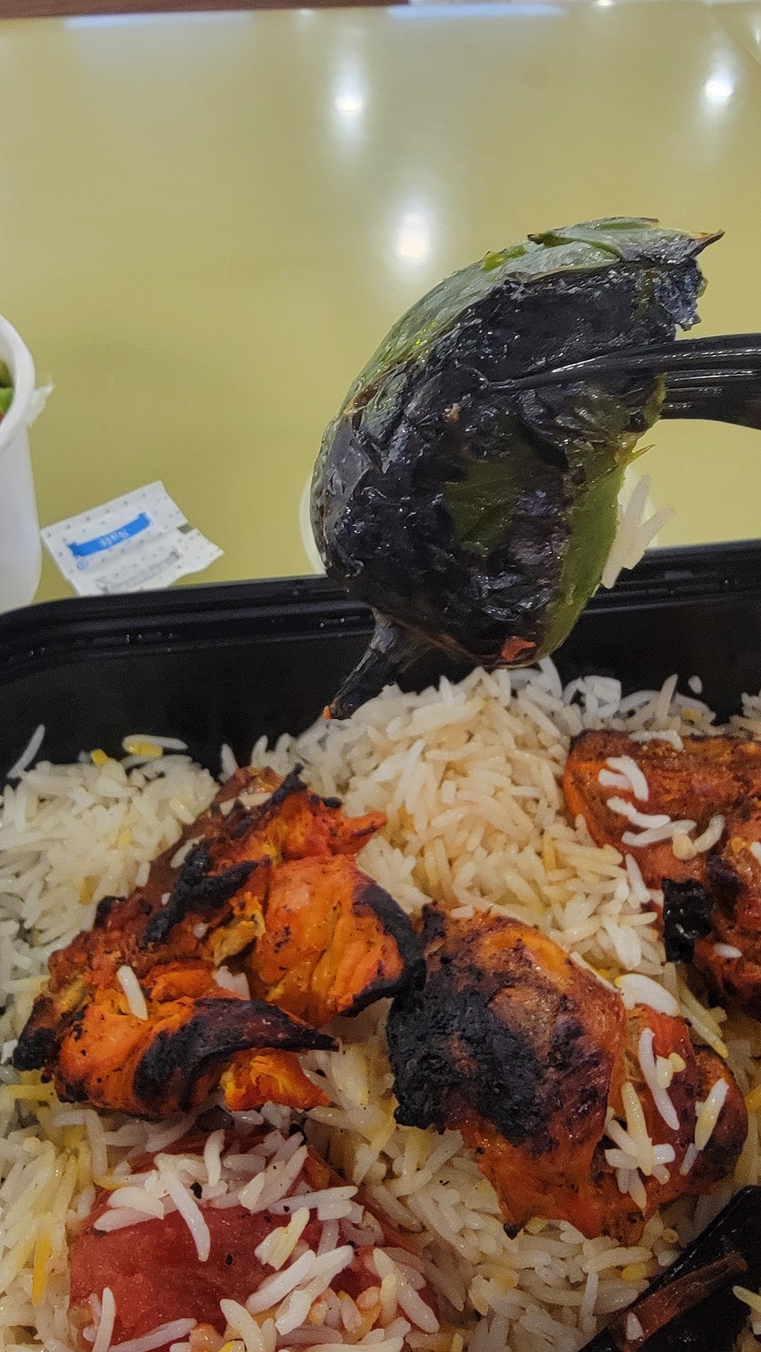 The amount of salt in the rice was way over normal. There were also many big chunks of rice (sign of fresh rice mixed with old rice). The rice was not fully cooked and was hard.