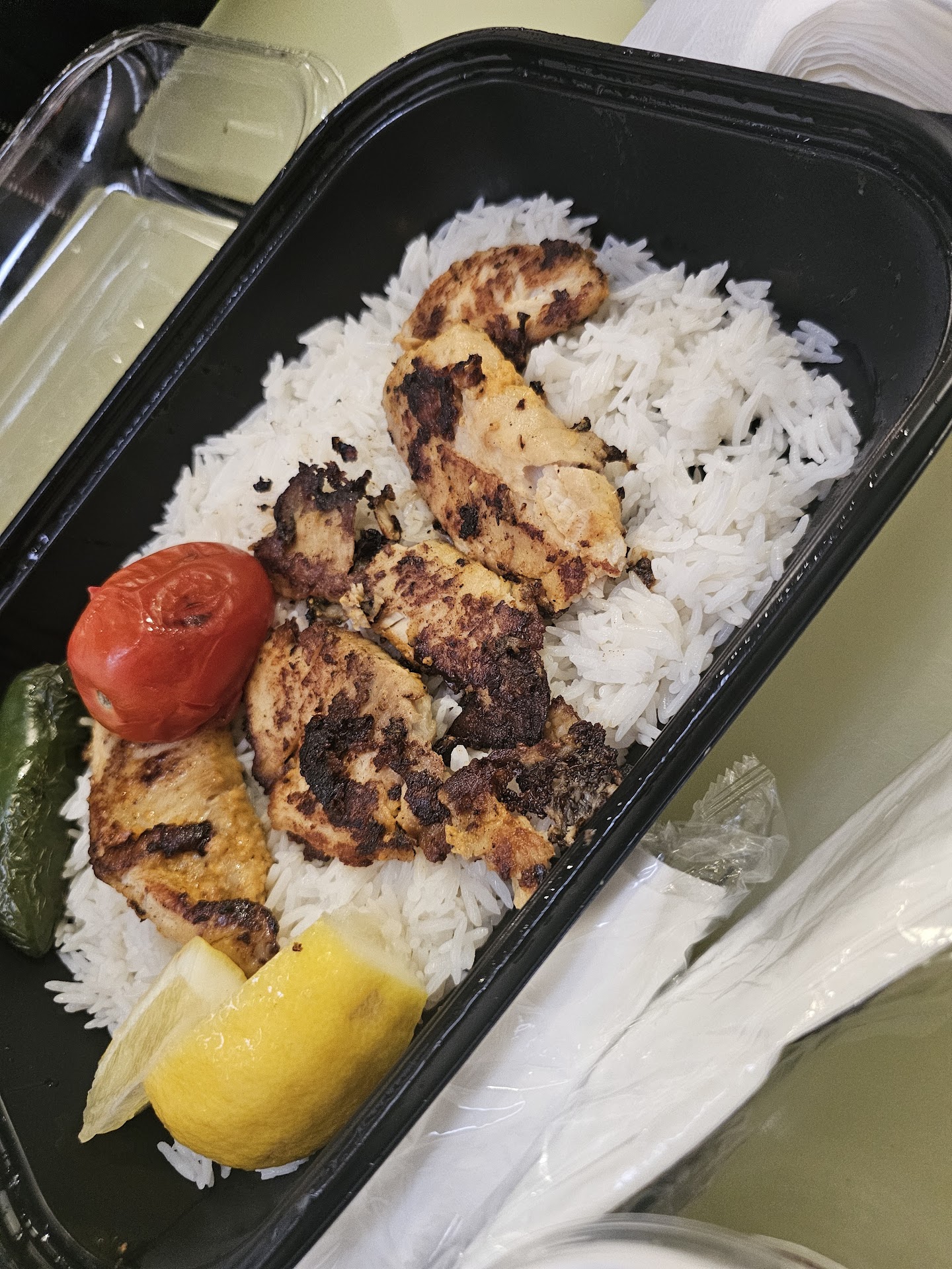Two things I love... tangy and spicy. One other that I’ve recently added: healthy. Ive been doing my best to avoid the typical junk that I put in my body so I tried something a little different. This place is pretty good. The menu pictures will make your mouth water. A lot to choose from. The salad bar looked so so but the tomato and cucumber salad was delicious! One bite and I was in love. I would’ve bought a whole container of it! Very light and refreshing taste. The chicken kabob that I ordered was tasty. Nothing to die for. The taste of charbroiled chicken with a bit of lemony flavor. The rice also had a bit of a tangy zest to it. The roasted tomato that it was paired with in addition to the pita slices was a good offset and/or balance. Overall I recommend trying it. Only minus one star because while I was waiting, one of the servers had a disagreement with a customer and started back and forth. The customer said she preferred salad instead of rice and the server insisted that she should have asked before hand. The customer said she shops here all the time and always does ask before hand but that it must not have been communicated. Even though the customer was a bit snappy in my opinion, being a customer service rep myself, I would never go back and forth with a customer. Wrong or not, you ave to hold your composure and diffuse the situation in the most cordial manner possible, particularly when other customers are watching. The server definitely popped an attitude and gave some smart remarks when she could have smiled, said “I’ll take care of you”, and asked that the customer could just make sure the order taker heard her clearly so that they could make sure to have her order perfect next time and...