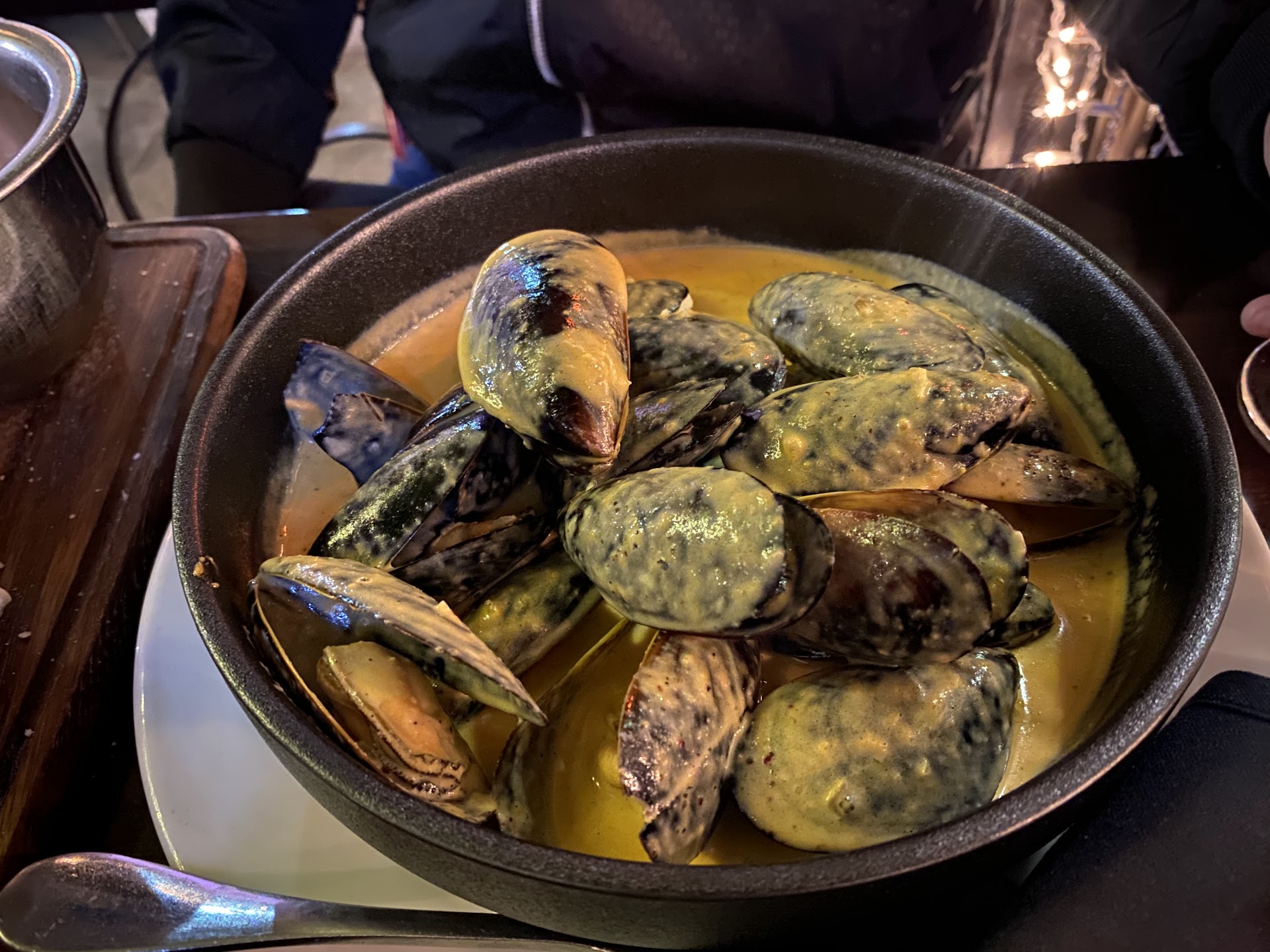 Based on a Tuesday night dinner, 7pm: All patio seating were occupied, so we snagged the last table for 2 inside. The interior is accessorized with warm lighting, large mirrors, dark wood, and merlot colored walls. Wine bottles and bowls of flavorful mussels and seafood found a spot on every table. All eaters indulging happily in conversation with their company and tabletop deliciousness.