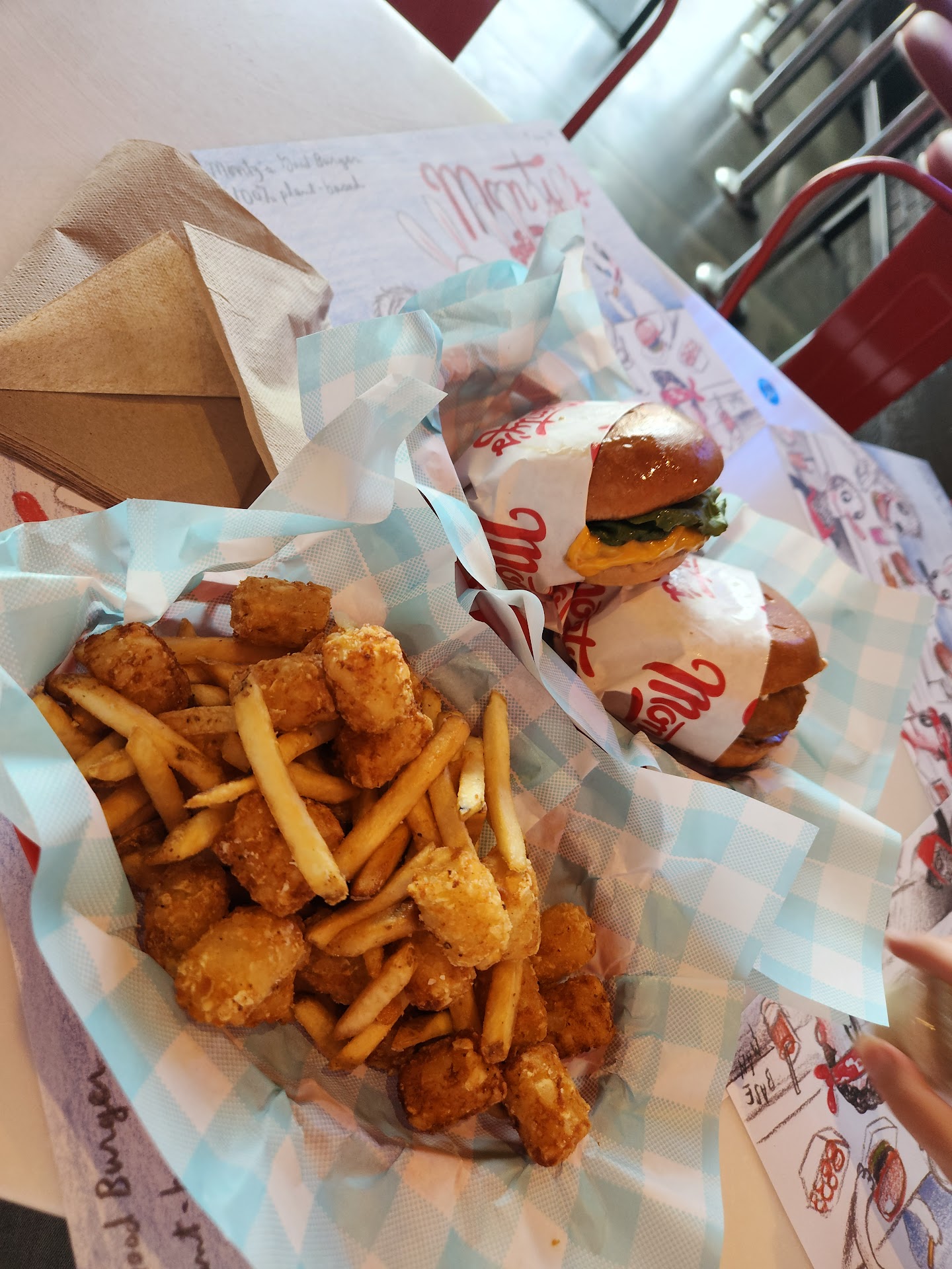 FOOD POETRY TRANSLATION: The chicken sandwich was the best we have ever tasted. Over years of traveling from Vegas to Portland to New Jersey, this has the best overall experience. The taste, texture, and preparation are expert-level. And it reminds you of how many delicacies lie in the littlest of details that we consumers normally take for granted. It wasn't overly salty, the flavor profile didn't lean bitter or sweet (sorry Mockingbird PDX). And the bite was believable enough to replace a carnist's chicken sandwich with while they're not looking (please do) and be comfortably confident that they would never tell a difference of lesser quality (likely more!). The burger was phenomenal and competed well with Hart House's burger. It was a tough call burger for burger because Hart's is pretty incredible, but the encounter here was a bit more memorable. The burger has a drop more juice, bite, and size to it. Whatever they do to the impossible burger here unlocks it's hidden potential, because I didn't know this high of a taste-level was possible from impossible. And their sauces? Out of this world. The house spread and onion aioli are vibrant, but not overpowering. They serve as a compliment to the meal, not a veil. The fries and tots are also highly recommended. Classically done fries and tots that leave no complaints.