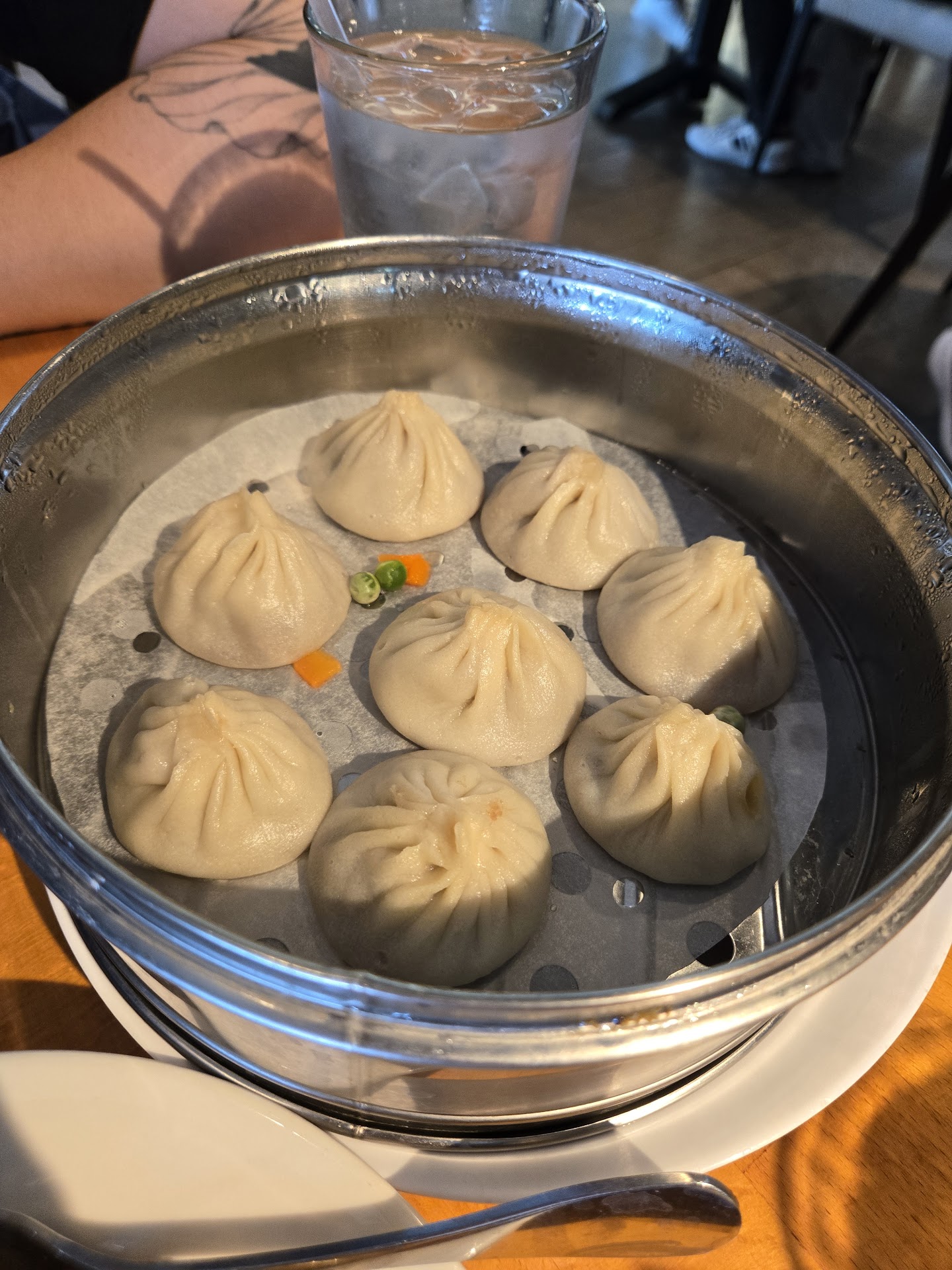 Pan fried juicy buns have a little savory meatball inside thatâs great. Chicken xiao long bao is certainly different (itâs usually pork) but still works well and the soup inside is tasty. SautĂŠed string beans were great too, not greasy and just a perfect amount of garlic.