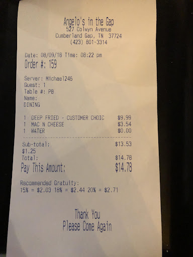 Read moreAnytime we are near the Gap, we enjoy dining at Angeloâs. We were within an hour of there and decided to drive up for dinner. We arrived at the restaurant at 7:34pm, and was immediately seated. We sat there for 20 minutes, before a waitress cto our table. She asked if we had been helped. My husband told her no, in which she asked who may have seated us, because the kitchen had already shut down. While we were sitting there, waiting for a server, we watched a larger group come in, be seated, and served drinks, well before we were even looked at. She said that the kitchen shut down 10 minutes ago, but we told her we have been sitting 20 minutes. We walked out at 7:58. My husband and I are very disappointed in this experience. If the kitchen was shut down, we should have been told so, or if we just missed the kitchen, they open it back up for 2 peoplesâ orders. We watched the servers walk back and forth, beside our table, never acknowledging us. We were the first table from the host stand, so itâs not like we were out of the way. The weather was pouring rain, and we made sure we would be there before closing. The door said open until 9pm. Angeloâs is special to us, as my husband and I had our first date there, enjoyed our honeymoon in the Gap, and love to go up any chance we have. Being turned away after being seated hurt us. Not a good way to keep a customer. Not sure when, or if, we...